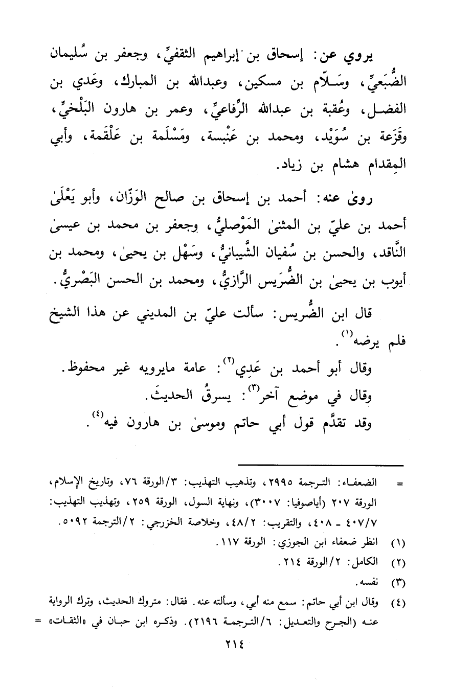 = الضعفاء: الترجمة 2995، وتذهيب التهذيب: 3 / الورقة 76، وتاريخ الاسلام، الورقة 207 (أياصوفيا: 3007) ، ونهاية السول، الورقة 259، وتهذيب التهذيب: 7 / 407 - 408، والتقريب: 2 / 48، وخلاصة الخزرجي: 2 / الترجمة 5092.