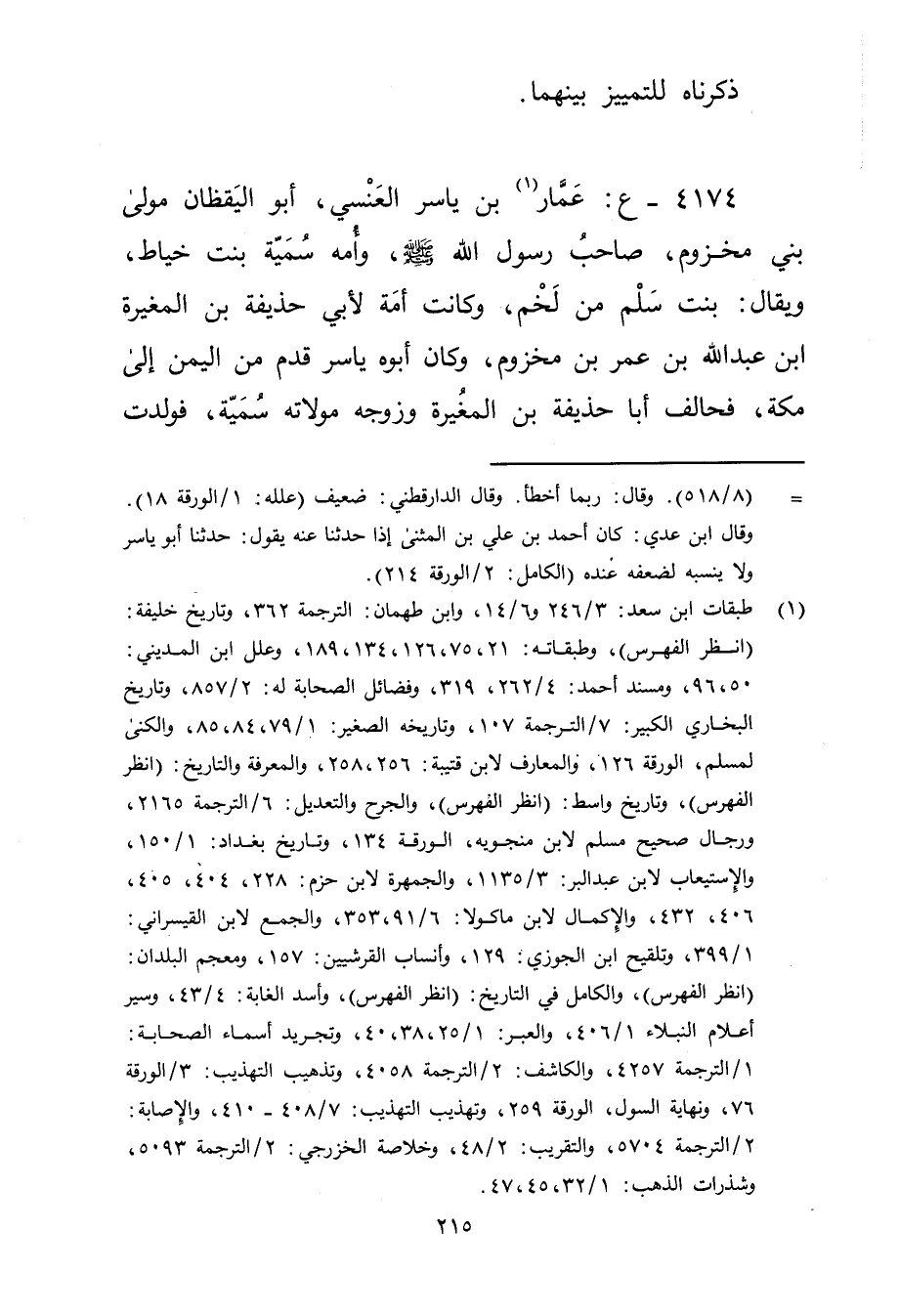 4174 - ع: عمار بن ياسر العنسي (1) ، أَبُو اليقظان مولى بْني مخزوم، صاحب رسول اللَّهِ صلى الله عليه وسلم، وأمه سميه بْنت خياط، ويُقال: بْنت سلم من لخم، وكانت أمة لأبي حذيفة بْن المغيرة ابن عَبد الله بن عُمَر بْن مخزوم، وكان أبوه ياسر قدم من اليمن إِلَى مكة، فحالف أبا حذيفة بْن المغيرة وزوجه مولاته سمية، فولدت