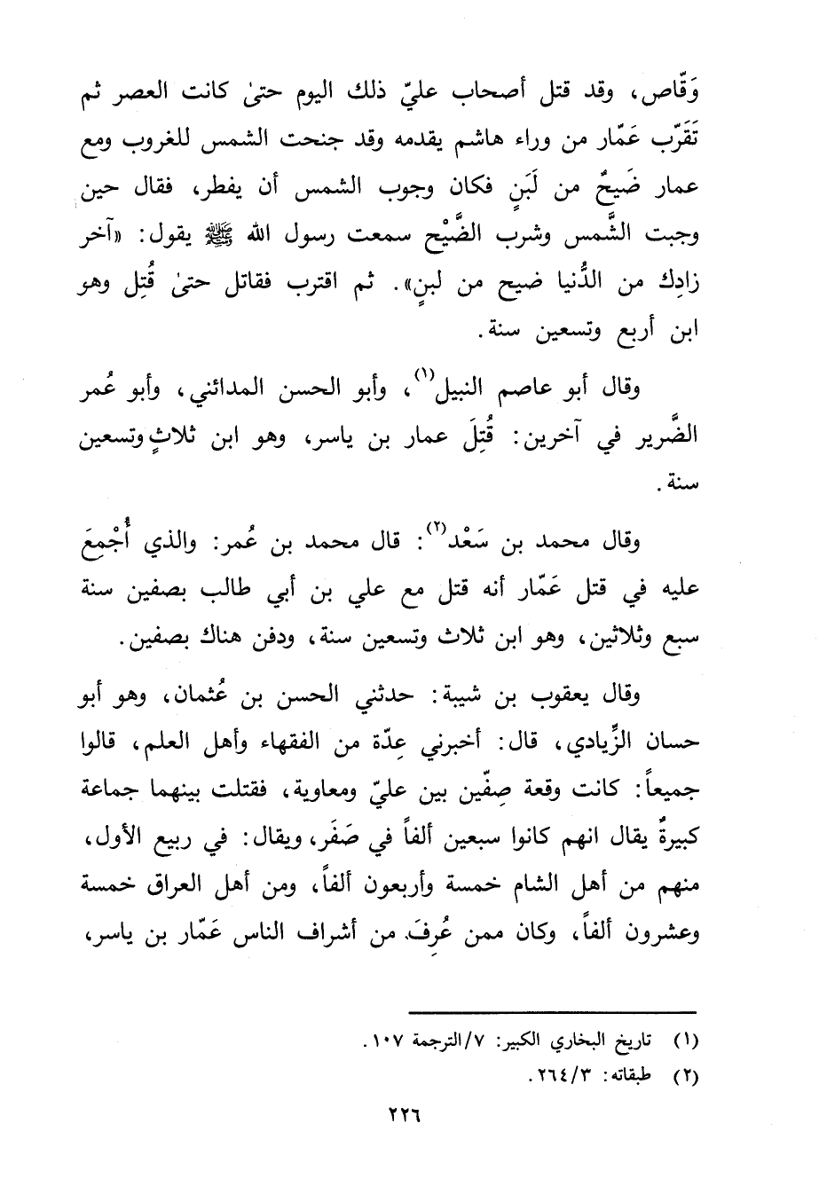 وَقَال أَبُو عاصم النبيل (1) ، وأبو الحسن المدائني، وأبو عُمَر الضرير فِي آخرين: قتل عَمَّارُ بْنُ يَاسِرٍ، وهُوَ ابْنُ ثلاث وتسعين سنة.