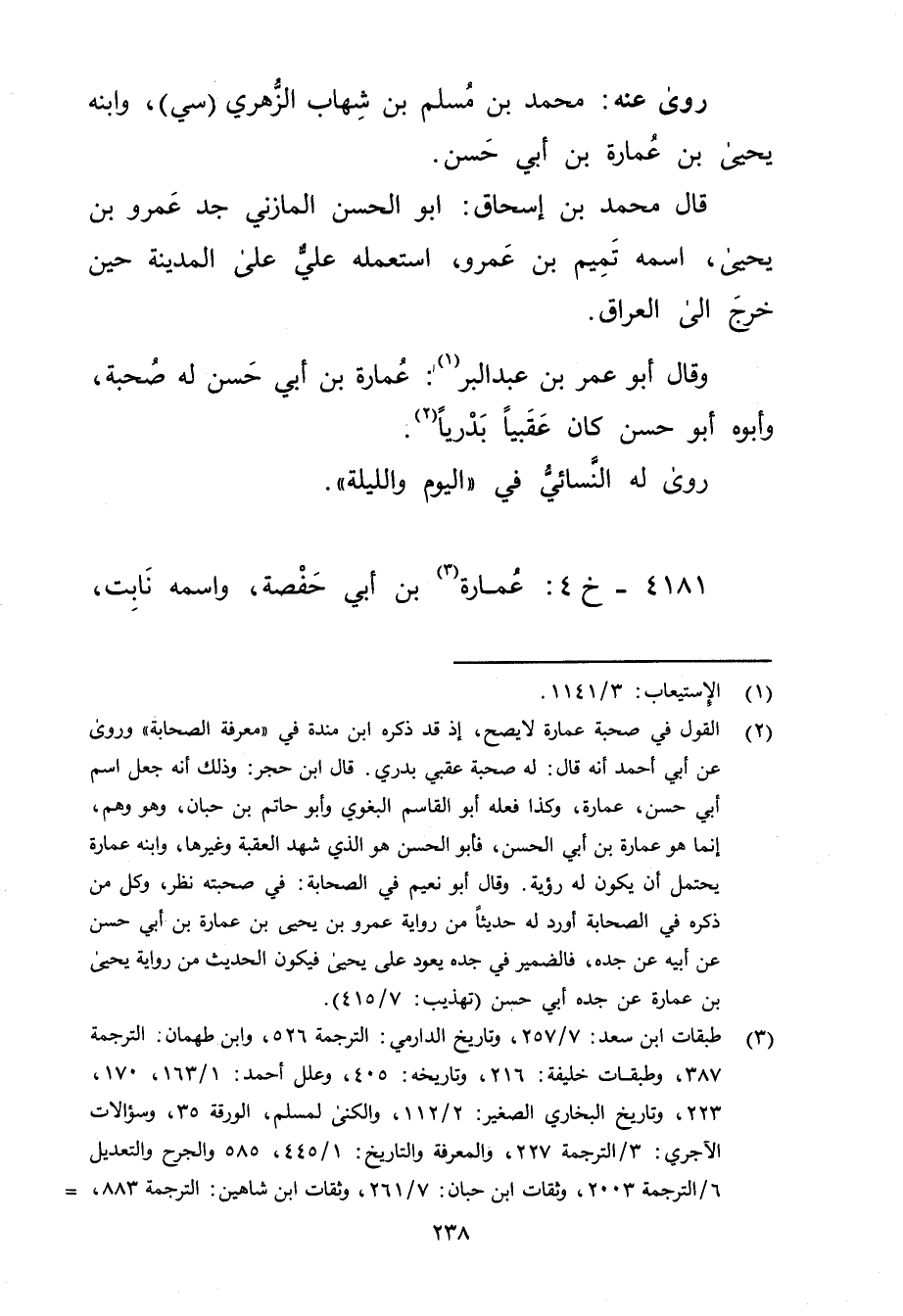 (2) القول في صحبة عمارة لا يصح، إذ قد ذكره ابن مندة في "معرفة الصحابة "وروى عَن أبي أحمد أنه قال: لهُ صُحبَةٌ عقبي بدري. قال ابن حجر: وذلك أنه جعل اسم أبي حسن، عمارة، وكذا فعله أبو الْقَاسِمِ البغوي وأَبُو حاتم بْن حبان، وهو وهم، إنما هو عمارة بن أَبي الحسن، فأبو الحسن هو الذي شهد العقبة وغيرها، وابنه عمارة يحتمل أن يكون له رؤية. وَقَال أبو نعيم في الصحابة: في صحبته نظر، وكل من ذكره في الصحابة أورد له حديثًا من رواية عَمْرو بن يحيى بن عمارة بن أَبي حسن عَن أبيه عن جده، فالضمير في جده يعود على يحيى فيكون الحديث من رواية يحيى بن عمارة عن جده أبي حسن (تهذيب: 7 / 415) .