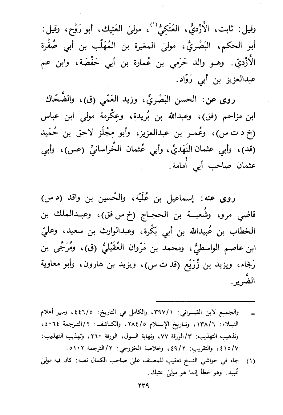 (1) جاء في حواشي النسخ تعقيب للمصنف على صاحب الكمال نصه: كان فيه مولى عُبَيد. وهو خطأ إنما هو مولى عتيك.