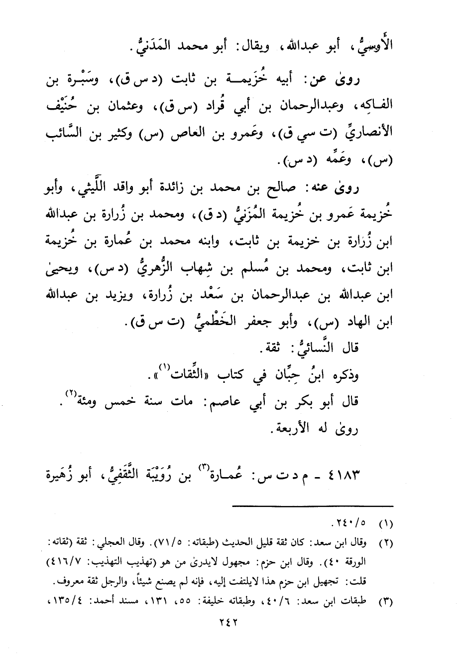 (2) وَقَال ابن سعد: كان ثقة قليل الحديث (طبقاته: 5 / 71) . وَقَال العجلي: ثقة (ثقاته: الورقة 40) . وَقَال ابن حزم: مجهول لا يدرى من هو (تهذيب التهذيب: 7 / 416) قلت: تجهيل ابن حزم هذا لا يلتفت إليه، فإنه لم يصنع شيئا، والرجل ثقة معروف.