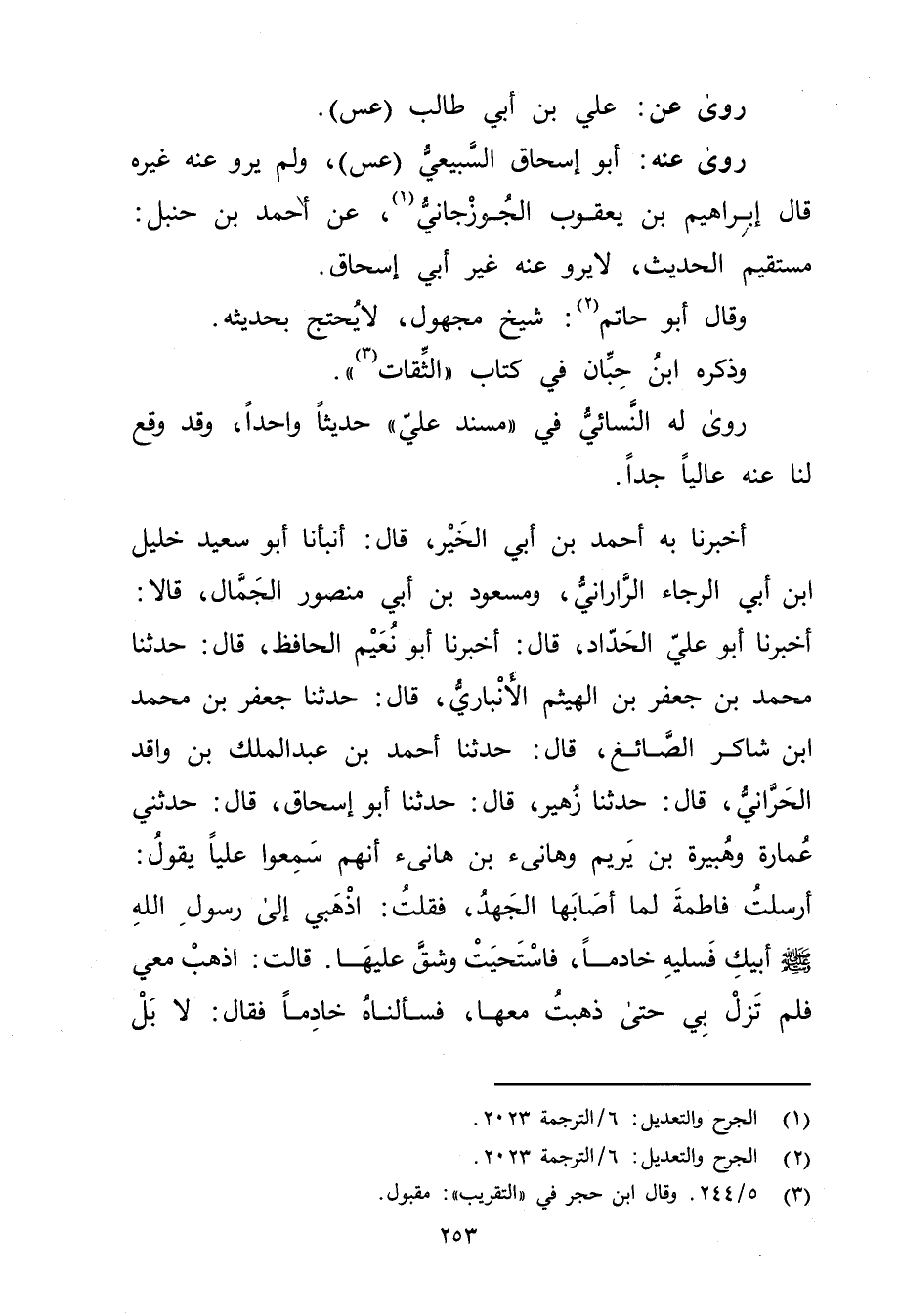 أخبرنا بِهِ أَحْمَدُ بْن أَبي الخير، قال: أَنْبَأَنَا أبو سَعِيد خليل ابن أَبي الرَّجَاءِ الرَّارَانِيُّ، ومَسْعُودُ بْنُ أَبي مَنْصُورٍ الْجَمَّالُ، قَالا: أَخْبَرَنَا أَبُو عَلِيّ الحداد، قال: أَخْبَرَنَا أَبُو نعيم الحافظ، قال: حَدَّثَنَا مُحَمَّد بْن جَعْفَر بْن الهيثم الأَنْبارِيّ، قال: حَدَّثَنَا جَعْفَرُ بْنُ محمد ابن شَاكِرٍ الصَّائِغُ، قال: حَدَّثَنَا أَحْمَدُ بْن عَبد المَلِك بْن واقد الْحَرَّانِيُّ، قال: حَدَّثَنَا زُهَيْرٌ، قال: حَدَّثَنَا أَبُو إِسْحَاقَ، قال: حَدَّثَنِي عُمَارَةُ وهُبَيْرَةُ بْنُ يَرِيمَ وهَانِئُ بْنُ هَانِئٍ أَنَّهُمْ سَمِعُوا عَلِيًّا يَقُولُ: أَرْسَلْتُ فَاطِمَةَ لَمَّا أَصَابَهَا الْجَهْدُ، فَقُلْتُ: اذْهَبِي إِلَى رَسُولِ اللَّهِ صلى الله عليه وسلم أَبِيكِ فَسَلِيهِ خَادِمًا، فَاسْتَحَيَتْ وشَقَّ عَلَيْهَا. قَالَتْ: اذْهَبْ مَعِي فَلَمْ تَزَلْ بِي حَتَّى ذَهَبْتُ مَعَهَا، فَسَأَلْنَاهُ خَادِمًا فَقَالَ: لا بَلْ