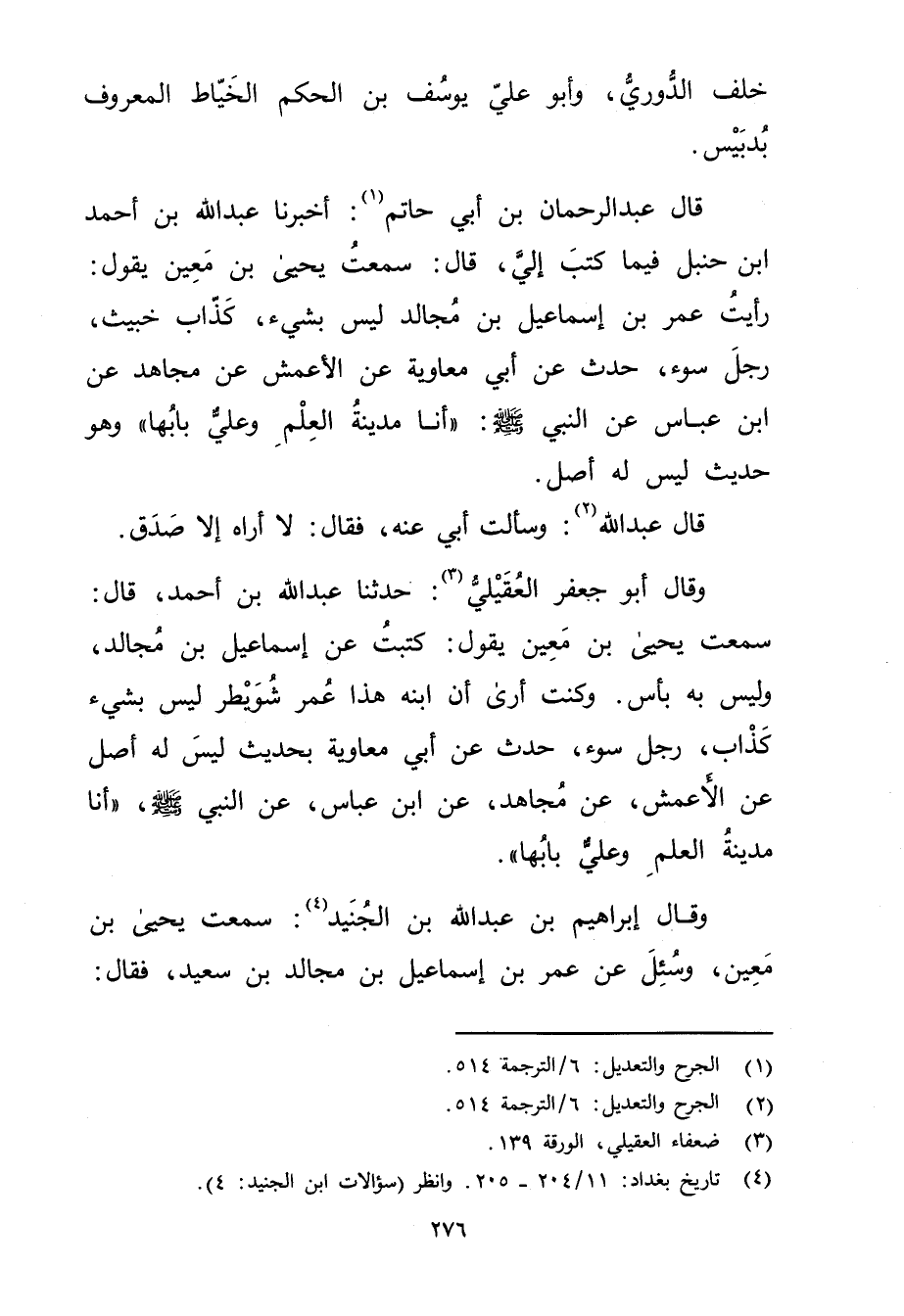 قال عَبْد الرَّحْمَنِ بْن أَبي حاتم (1) : أَخْبَرَنَا عَبد اللَّهِ بْن أَحْمَد بْن حنبل فيما كتب إلي، قال: سمعت يحيى بْن مَعِين يقول: رأيت عُمَر بْن إسماعيل بْن مجالد ليس بشيءٍ، كذاب خبيث، رجل سوء، حَدَّثَ عَن أَبِي مُعَاوِيَةَ عَنِ الأَعْمَشِ عن مجاهد عن ابْن عَبَّاس عَنِ النَّبِيِّ صلى الله عليه وسلم: "أَنَا مَدِينَةُ الْعِلْمِ وعَلِيٌّ بَابُهَا "وهو حديث ليس لَهُ أصل.