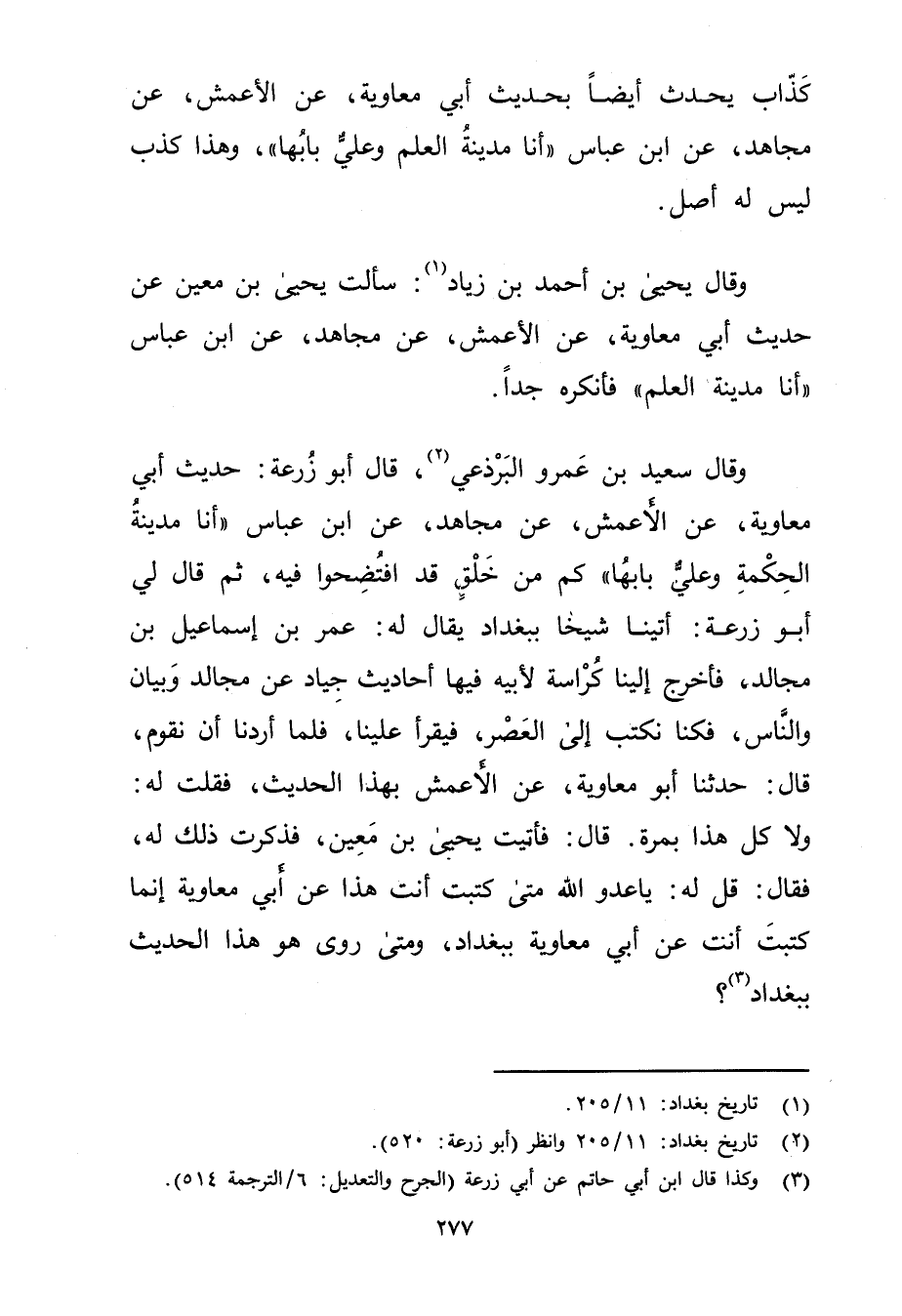 وَقَال يحيى بْن أحمد بْن زياد (1) : سألت يَحْيَى بْنَ مَعِين عَنْ حَدِيثِ أَبِي مُعَاوِيَةَ، عَنِ الأَعْمَشِ، عَنْ مجاهد، عن ابن عباس "أنا مدينة العلم "فأنكره جدا.
