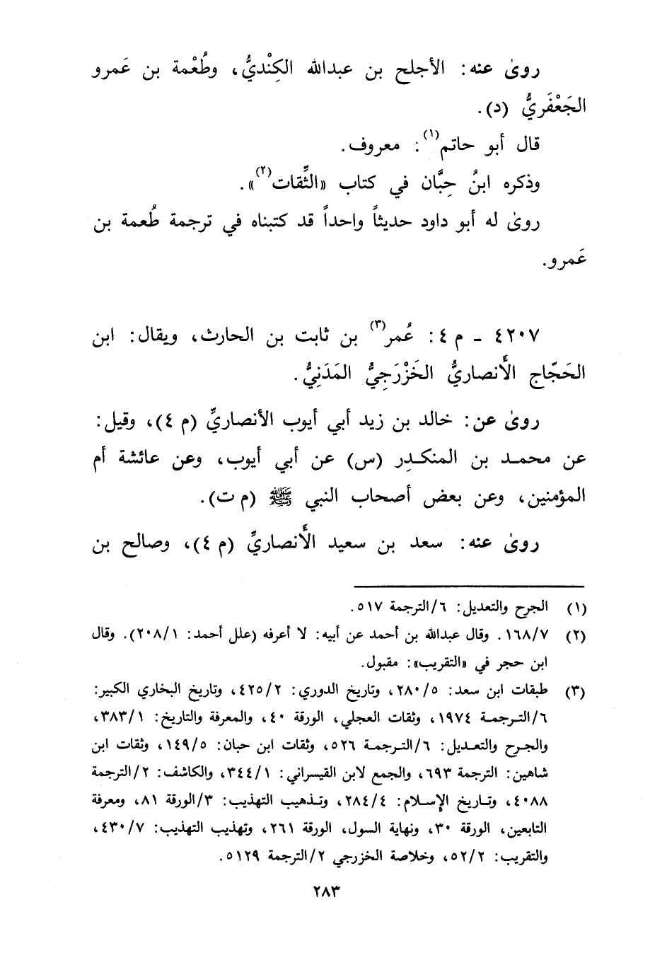 (3) طبقات ابن سعد: 5 / 280، وتاريخ الدوري: 2 / 425، وتاريخ البخاري الكبير: 6 / الترجمة 1974، وثقات العجلي، الورقة 40، والمعرفة والتاريخ: 1 / 383، والجرح والتعديل: 6 / الترجمة 526، وثقات ابن حبان: 5 / 149، وثقات ابن شاهين: الترجمة 693، والجمع لابن القيسراني: 1 / 344، والكاشف: 2 / الترجمة 4088، وتاريخ الاسلام: 4 / 284، وتذهيب التهذيب: 3 / الورقة 81، ومعرفة التابعين، الورقة 30، ونهاية السول، الورقة 261، وتهذيب التهذيب: 7 / 430، والتقريب: 2 / 52، وخلاصة الخزرجي 2 / الترجمة 5129.