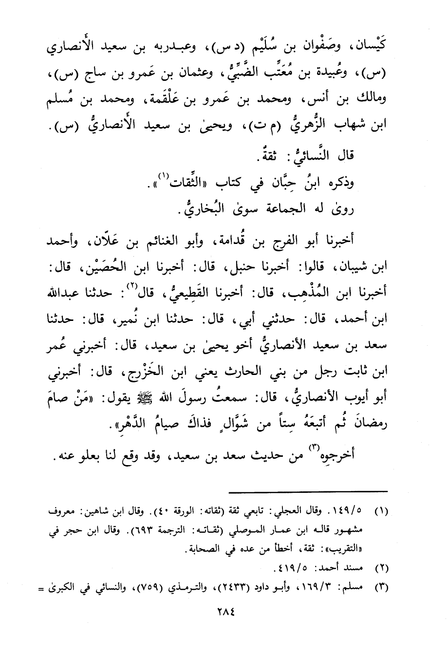 أخبرنا أَبُو الْفَرَجِ بْنُ قُدَامَةَ، وأَبُو الْغَنَائِمِ بْن علان، وأحمد بْن شيبان، قَالُوا: أخبرنا حنبل، قال: أخبرنا ابْنُ الْحُصَيْنِ، قال: أخبرنا ابْنُ الْمُذْهِب، قال: أخبرنا القَطِيعِيّ، قال (2) : حَدَّثَنَا عَبد اللَّهِ بْنُ أَحْمَدَ، قال: حَدَّثني أبي، قال: حَدَّثَنَا ابْنُ نُمَيْرٍ، قال: حَدَّثَنَا سَعْدُ بْنُ سَعِيد الأَنْصارِيّ أَخُو يَحْيَى بْنِ سَعِيد، قال: أَخْبَرَنِي عُمَر ابن ثَابِتٍ رَجُلٌ مِنْ بَنِي الْحَارِثِ يَعْنِي ابْنَ الْخَزْرَجِ، قال: أَخْبَرَنِي أَبُو أَيُّوبَ الأَنْصارِيّ، قال: سمعت رَسُول اللَّهِ صلى الله عليه وسَلَّمَ يَقُولُ: "مَنْ صَامَ رَمَضَانَ ثُمَّ أَتْبَعَهُ سِتًّا مِنْ شَوَّالٍ فَذَاكَ صِيَامُ الدَّهْرِ.