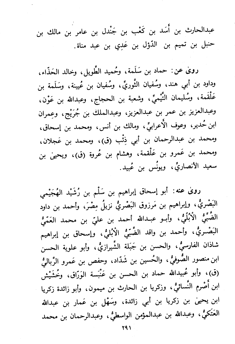 رَوَى عَن: حماد بْن سلمة، وحميد الطويل، وخالد الحذاء، وداود بْن أَبي هند، وسفيان الثوري، وسفيان بْن عُيَيْنَة، وسلمة بْن علقمة، وسُلَيْمان التَّيْمِيّ، وشعبة بْن الحجاج، وعبد اللَّهِ بن عون، وعبد العزيز بْن عُمَر بْن عَبْد العزيز، وعبد الملك بْن جُرَيْج، وعِمْران ابن حدير، وعوف الأعرابي، ومالك بْن أنس، ومحمد بْن إسحاق، ومحمد بْن عَبْد الرَّحْمَنِ بْن أَبي ذئب (ق) ، ومحمد بْن عجلان، ومحمد بْن عَمْرو بْن علقمة، وهشام بْن عروة (ق) ، ويحيى بن سَعِيد الأَنْصارِيّ، ويونس بن عُبَيد.