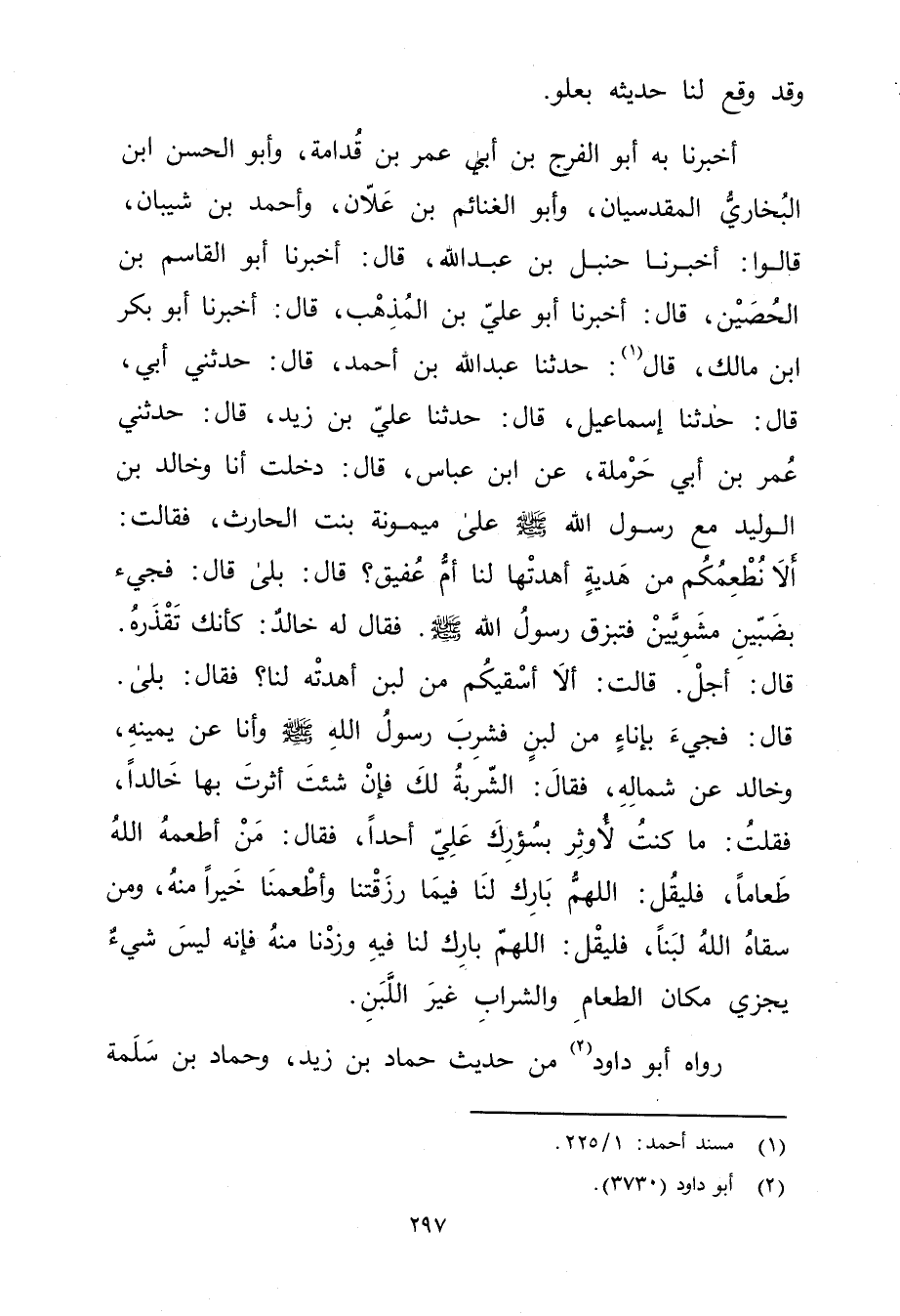 أَخْبَرَنَا بِهِ أَبُو الْفَرَجِ بْنُ أَبي عُمَر بْن قدامة، وأبو الْحَسَنِ بْنُ الْبُخَارِيِّ الْمَقْدِسِيَّانِ، وأَبُو الغنائم بْن علان، وأحمد بْن شَيْبَانَ، قَالُوا: أَخْبَرَنَا حَنْبَلُ بْنُ عَبد اللَّهِ، قال: أخبرنا أَبُو القاسم بْن الحصين، قال: أَخْبَرَنَا أبو علي بْن المذهب، قال: أَخْبَرَنَا أبو بكر بْن مالك، قال (1) : حَدَّثَنَا عَبد اللَّهِ بْن أَحْمَدَ، قال: حَدَّثني أبي، قال: حَدَّثَنَا إِسْمَاعِيلُ، قال: حَدَّثَنَا عَلِيُّ بْنُ زَيْدٍ، قال: حَدَّثَنِي عُمَر بْنُ أَبي حَرْمَلَةَ، عن ابْنِ عَبَّاسٍ، قال: دَخَلْتُ أَنَا وخَالِدُ بْنُ الْوَلِيدِ مَعَ رَسُولِ اللَّهِ صَلَّى اللَّهُ عَلَيْهِ وسَلَّمَ على مَيْمُونَةَ بِنْتِ الْحَارِثِ، فَقَالَتْ: أَلا نُطْعِمُكُمْ مِنْ هَدِيَّةٍ أَهْدَتْهَا لَنَا أُمُّ عُفَيْقٍ؟ قال: بَلَى قال: فجئ بِضَبَّيْنِ مَشْوِيَّيْنِ فَتَبَزَّقَ رَسُولُ اللَّهِ صلى الله عليه وسلم. فَقَالَ لَهُ خَالِدٌ: كَأَنَّكَ تَقْذَرُهُ. قال: أَجَلْ. قَالَتْ: أَلا أَسْقِيكُمْ مِنْ لَبَنٍ أَهْدَتْهُ لَنَا؟ فَقَالَ: بَلَى. قال: فجئ بِإِنَاءٍ مِنْ لَبَنٍ فَشَرِبَ رَسُولُ اللَّهِ صلى الله عليه وسلم وأَنَا عن يَمِينِهِ، وخَالِدٌ عن شِمَالِهِ، فَقَالَ: الشَّرْبَةُ لَكَ فَإِنْ شِئْتَ أَثَرْتَ بِهَا خَالِدًا، فَقُلْتُ: مَا كُنْتُ لأُوثِرُ بِسُؤْرِكَ عَلَيَّ أَحَدًا، فَقَالَ: مَنْ أَطْعَمَهُ اللَّهُ طَعَامًا، فَلْيَقُلْ: اللَّهُمَّ بَارِكْ لَنَا فِيمَا رَزَقْتَنَا وأَطْعِمْنَا خَيْرًا مِنْهُ، ومَنْ سَقَاهُ اللَّهُ لَبَنًا، فَلْيَقُلْ: اللَّهُمَّ بَارِكْ لَنَا فِيهِ وزِدْنَا مِنْهُ فَإِنَّهُ لَيْسَ شَيْءٌ يُجْزِي مَكَانَ الطَّعَامِ والشَّرَابِ غَيْرَ اللَّبَنِ.