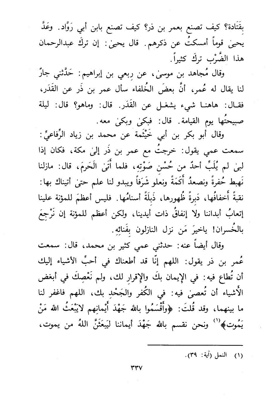 وَقَال أيضا عَنه: حَدَّثَنِي عمي كثير بْن محمد، قال: سمعت عُمَر بْن ذر يقول: اللَّهم إنا قد أطعناك فِي أحب الأشياء إليك أن تطاع فِيهِ: فِي الإيمان بك والإقرار لك، ولم نعصك فِي أبغض الأشياء أن تعصي فِيهِ: فِي الكفر والجحد بك، اللَّهم فاغفر لنا ما بينهما، وقد قُلْتُ: [وأقسموا باللَّه جهد أيمانهم لا يبعث اللَّه من يموت] (1) ونحن نقسم باللَّه جهد أيماننا ليبعثن اللَّه من يموت،