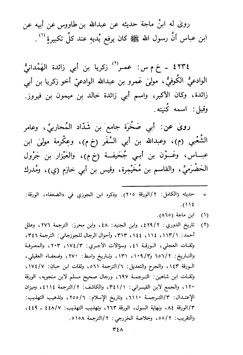 4234 - خ م س: عُمَر زكريا بن أَبي زائدة الهمداني الوادعي الكوفي (2) ، مولى عَمْرو بْن عَبد الله الوادعي أخو زكريا بْن أَبي زائدة، وكان الأكبر، واسم أَبِي زائدة خالد بْن ميمون بْن فيروز.