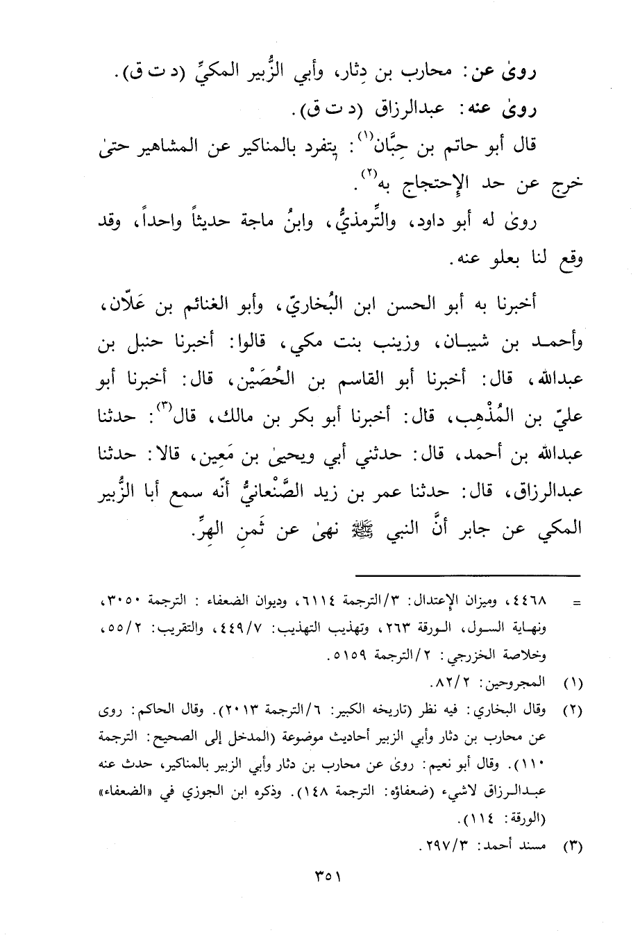 أَخْبَرَنَا بِهِ أَبُو الْحَسَنُ بْنُ الْبُخَارِيِّ، وأَبُو الْغَنَائِمِ بْن علان، وأحمد بْن شيبان، وزَيْنَبُ بِنْتُ مَكِّيٍّ، قَالُوا: أَخْبَرَنَا حنبل بْن عَبد الله، قال: أَخْبَرَنَا أبو القاسم بْن الحصين، قال: أَخْبَرَنَا أَبُو علي بْن المذهب، قال: أَخْبَرَنَا أبو بكر بْن مالك، قال (3) : حَدَّثَنَا عَبد اللَّهِ بْن أَحْمَدَ، قال: حَدَّثني أَبِي ويَحْيَى بْنُ مَعِين، قَالا: حَدَّثَنَا عَبْدُ الرَّزَّاقِ، قال: حَدَّثَنَا عُمَر بْنُ زَيْدٍ الصَّنْعَانِيُّ أَنَّهُ سَمِعَ أَبَا الزُّبَيْرِ الْمَكِّيَّ عن جابر أن النَّبِيّ صَلَّى اللَّهُ عَلَيْهِ وسَلَّمَ نَهَى عن ثَمَنِ الهر.