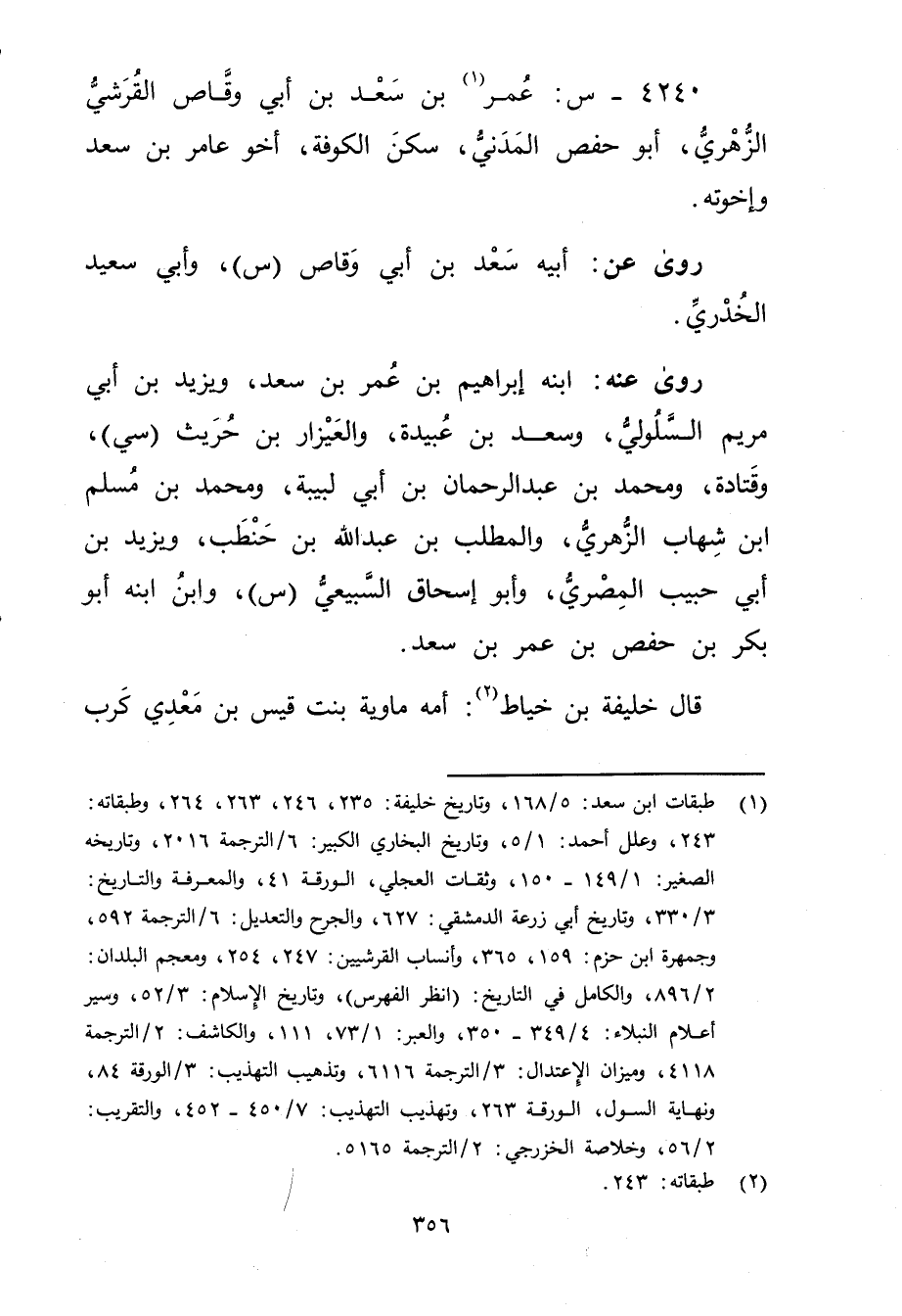 4240 - س: عُمَر بن سعد بن أَبي وقاص القرشي الزُّهْرِيّ (1) ، أَبُو حفص المدني، سكن الكوفة، أخو عامر بْن سعد وإخوته.