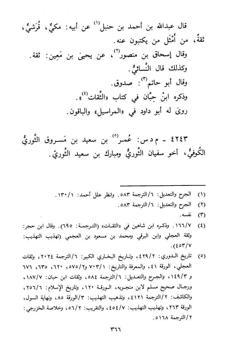 (5) تاريخ الدوري: 2 / 429، وتاريخ البخاري الكبير: 6 / الترجمة 2024، وثقات العجلي، الورقة 41، والمعرفة والتاريخ: 1 / 703 و2 / 575، 620، 635، 676 و3 / 149، والجرح والتعديل: 6 / الترجمة 584، وثقات ابن حبان: 7 / 187، ورجال صحيح مسلم لابن منجويه، الورقة 120، وتاريخ الاسلام: 6 / 256، والكاشف: 2 / الترجمة 4121، وتذهيب التهذيب: 3 / الورقة 85، ونهاية السول، الورقة 263، وتهذيب التهذيب: 7 / 454، والتقريب: 2 / 56، وخلاصة الخزرجي: 2 / الترجمة 5168.
