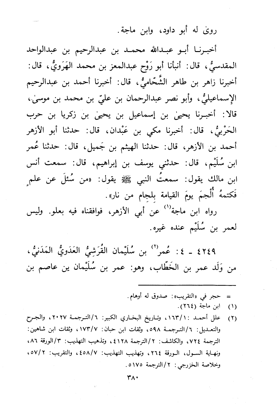 أخبرنا أبو عبد الله مُحَمَّدِ بْنِ عَبد الرَّحِيمِ بْنِ عَبْدِ الْوَاحِدِ الْمَقْدِسِيُّ، قال: أَنْبَأَنَا أبو روح عبد المعز بْنُ مُحَمَّدٍ الْهَروي، قال: أَخْبَرَنَا زَاهِرُ بْنُ طَاهِرٍ الشَّحَّامِيُّ، قال: أَخْبَرَنَا أَحْمَدُ بْنُ عَبد الرَّحِيمِ الإِسماعيلي، وأَبُو نَصْر عَبْد الرَّحْمَنِ بْن علي بْن مُحَمَّد بْن مُوسَى، قَالا: أخبرنا يَحْيَى بْنُ إِسْمَاعِيل بْن يَحْيَى بْن زكريا بْن حرب الحربي، قال: أَخْبَرَنَا مكي بن عبدان، قال: حَدَّثَنَا أبو الأزهر أحمد بْن الأزهر، قال: حَدَّثَنَا الْهَيْثَمُ بْنُ جَمِيلٍ، قال: حَدَّثَنَا عُمَر ابن سُلَيْمٍ، قال: حَدَّثَنِي يُوسُفُ بْنُ إبراهيم، قال: سمعت أنس ابن مَالِكٍ يَقُولُ: سمعت النَّبِيَّ صَلَّى اللَّهُ عَلَيْهِ وسَلَّمَ يَقُولُ: "مَنْ سُئِلَ عن عِلْمٍ فَكَتَمَهُ أُلْجِمَ يَوْمَ الْقِيَامَةِ بِلِجَامٍ مِنْ نَارٍ.
