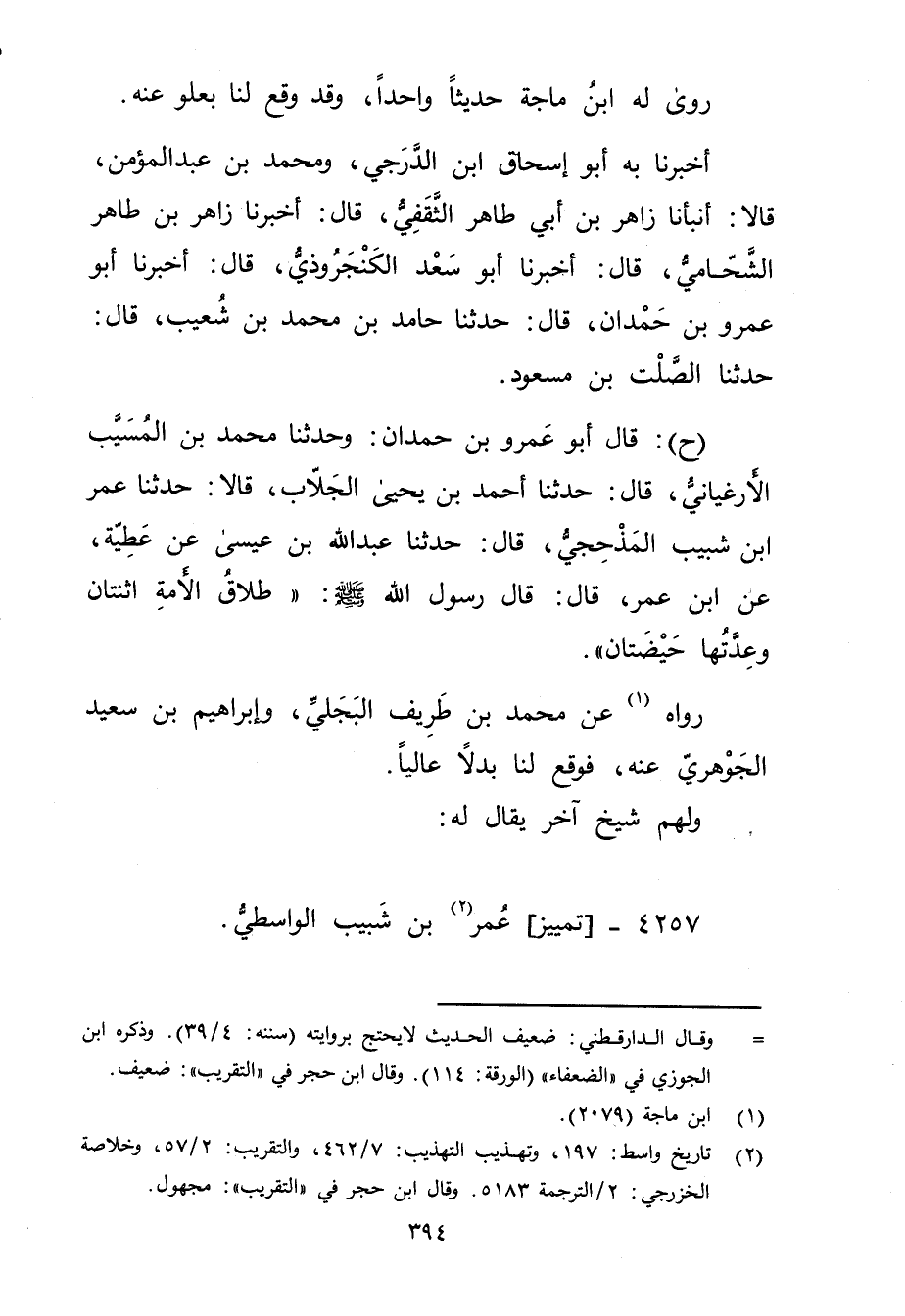 (ح) : قال أَبُو عَمْرو بْنُ حَمْدَانَ: وحَدَّثَنَا مُحَمَّدُ بْنُ المُسَيَّب الأَرْغِيَانِيُّ، قال: حَدَّثَنَا أَحْمَدُ بْنُ يَحْيَى الْجَلابُ، قَالا: حَدَّثَنَا عُمَر ابن شَبِيبٍ الْمَذْحِجِيُّ، قال: حَدَّثَنَا عَبد اللَّهِ بْنُ عِيسَى عن عَطِيَّةَ، عَنِ ابْنِ عُمَر، قال: قال رَسُول اللَّهِ صلى الله عليه وسَلَّمَ: "طَلاقُ الأَمَةِ اثْنَتَانِ وعِدَّتُهَا حَيْضَتَانِ.