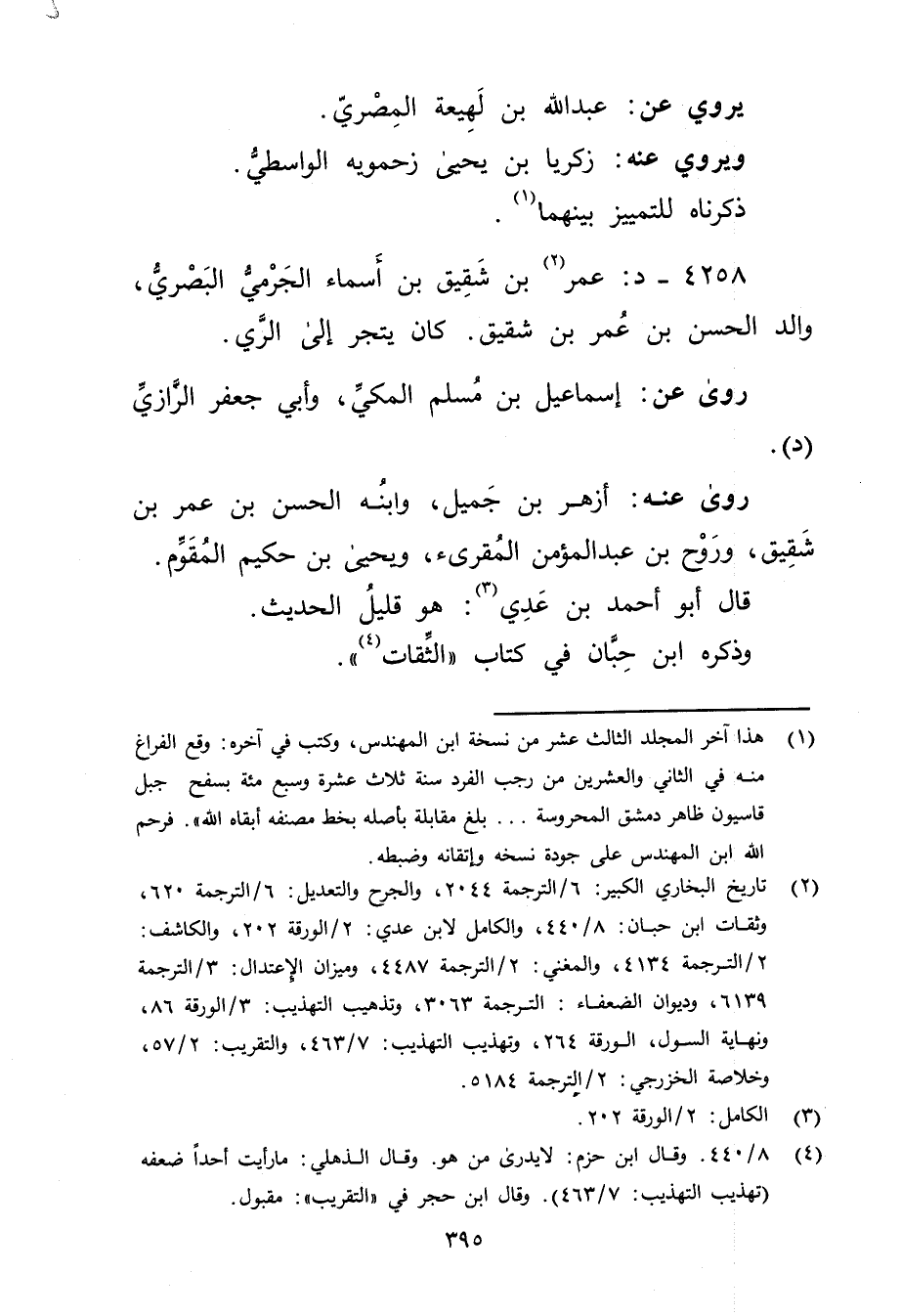 4258 - د: عُمَر بن شقيق بن أسماء الجرمي البَصْرِيّ (2) ، والد الحسن بْن عُمَر بْن شقيق. كَانَ يتجر إِلَى الري.
