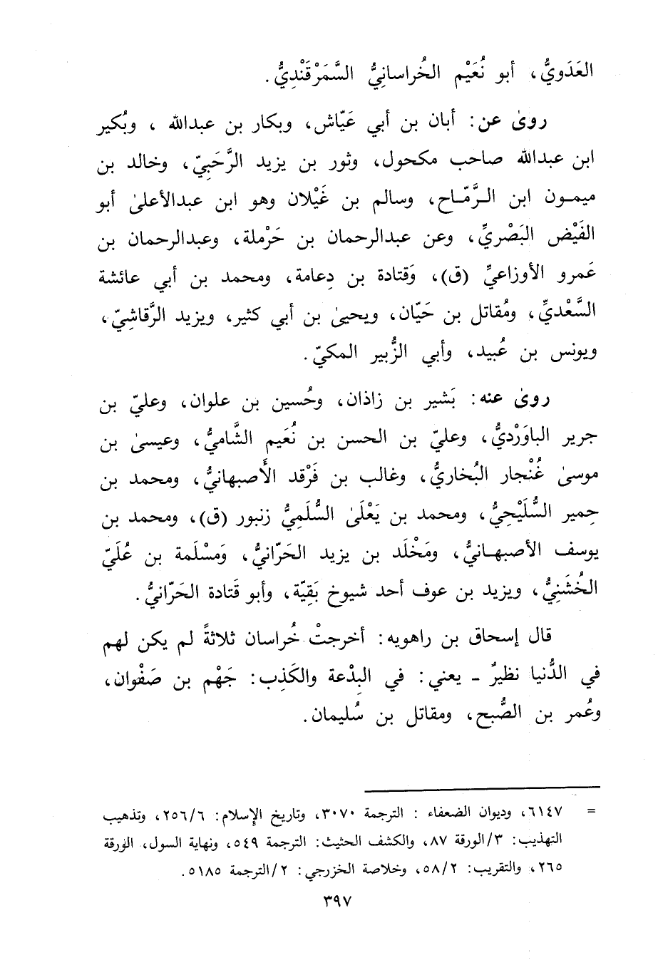 = 6147، وديوان الضعفاء: الترجمة 3070، وتاريخ الاسلام: 6 / 256، وتذهيب التهذيب: 3 / الورقة 87، والكشف الحثيث: الترجمة 549، ونهاية السول، الورقة 265، والتقريب: 2 / 58، وخلاصة الخزرجي: 2 / الترجمة 5185.