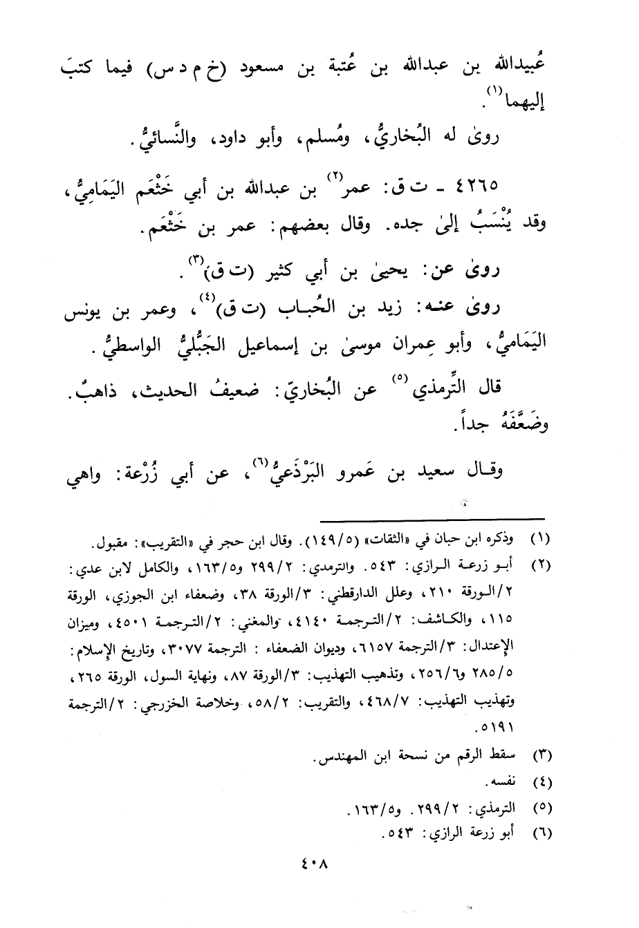 (2) أبو زُرْعَة الرازي: 543. والتِّرْمِذِيّ: 2 / 299 و5 / 163، والكامل لابن عدي: 2 / الورقة 210، وعلل الدارقطني: 3 / الورقة 38، وضعفاء ابن الجوزي، الورقة 115، والكاشف: 2 / الترجمة 4140، والمغني: 2 / الترجمة 4501، وميزان الاعتدال: 3 / الترجمة 6157، وديوان الضعفاء: الترجمة 3077، وتاريخ الاسلام: 5 / 285 و6 / 256، وتذهيب التهذيب: 3 / الورقة 87، ونهاية السول، الورقة 265، وتهذيب التهذيب: 7 / 468، والتقريب: 2 / 58، وخلاصة الخزرجي: 2 / الترجمة 5191.