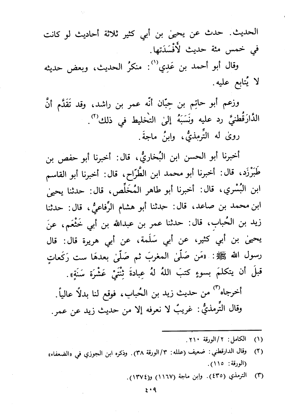 الحديث. حدث عن يحيى بْن أَبي كثير ثلاثة أحاديث لَوْ كانت في خمس مئة حديث لأفسدتها.