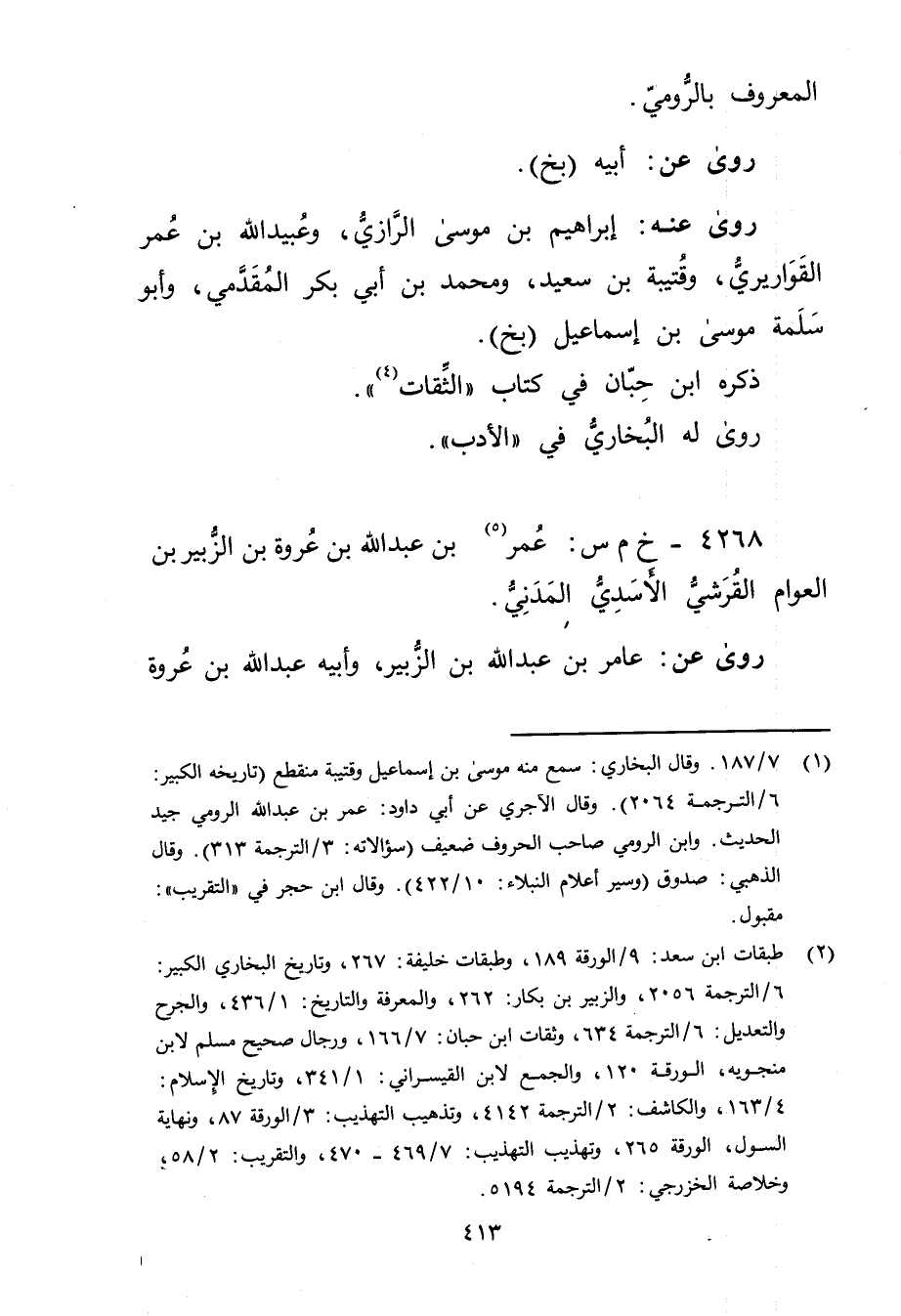(1) 7 / 187. وقَال البُخارِيُّ: سمع منه موسى بن إسماعيل وقتيبة منقطع (تاريخه الكبير: 6 / الترجمة 2064) . وَقَال الآجري عَن أَبِي داود: عُمَر بن عَبد الله الرومي جيد