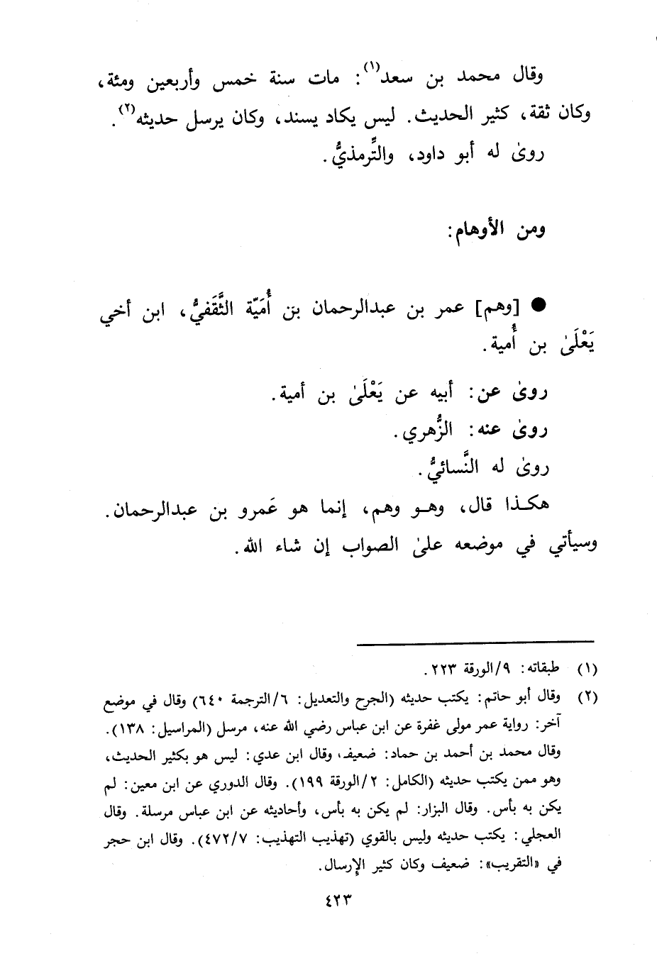 (2) وَقَال أبو حاتم: يكتب حديثه (الجرح والتعديل: 6 / الترجمة 640) وَقَال في موضع آخر: رواية عُمَر مولى غفرة عَنِ ابْنِ عَبَّاسٍ رَضِيَ اللَّهُ عنه، مرسل (المراسيل: 138) .