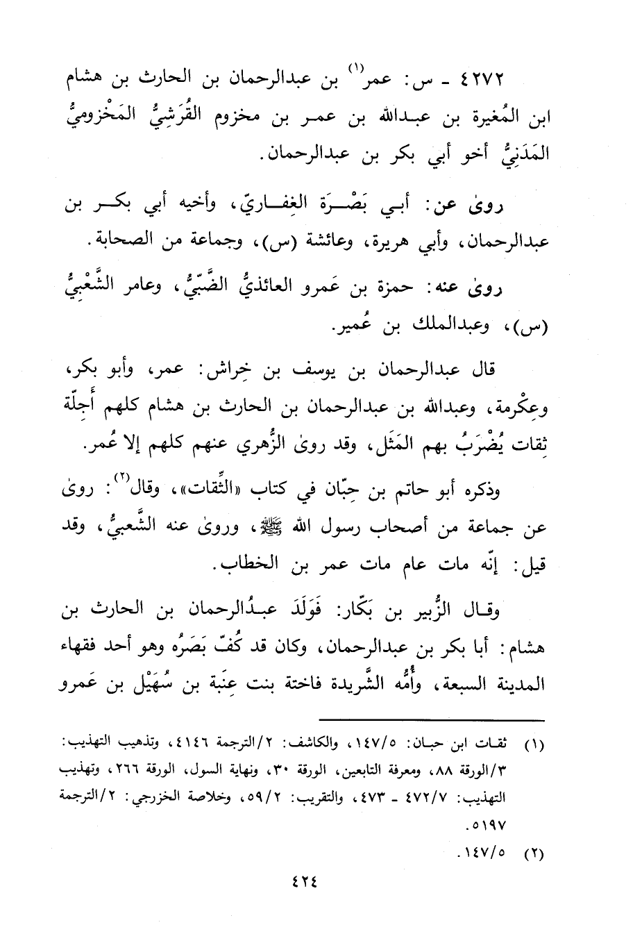 4272 - س: عُمَر بْن عَبْد الرَّحْمَنِ بْن الحارث بن هشام ابن المغيرة بْن عَبد الله بْن عُمَر بْن مخزوم القرشي المخزومي المدني (1) أَخُو أَبِي بَكْر بْن عَبْد الرحمن.