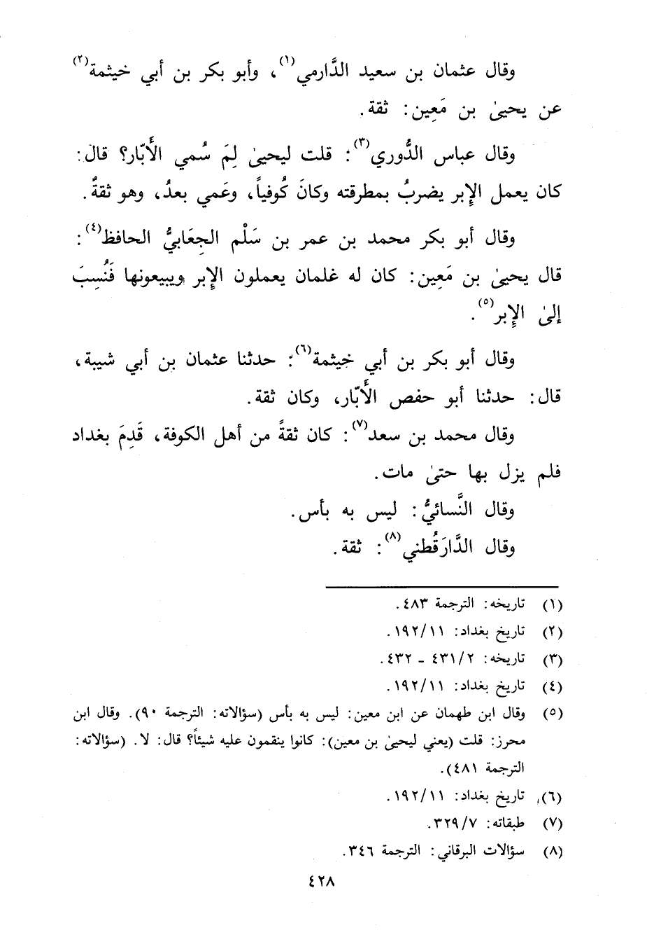 وَقَال عَباس الدُّورِيُّ (3) : قلت ليحيى لم سمي الأبار؟ قال: كَانَ يعم الإبر يضرب بمطرقته وكان كوفيا، وعمي بعد، وهو ثقة.