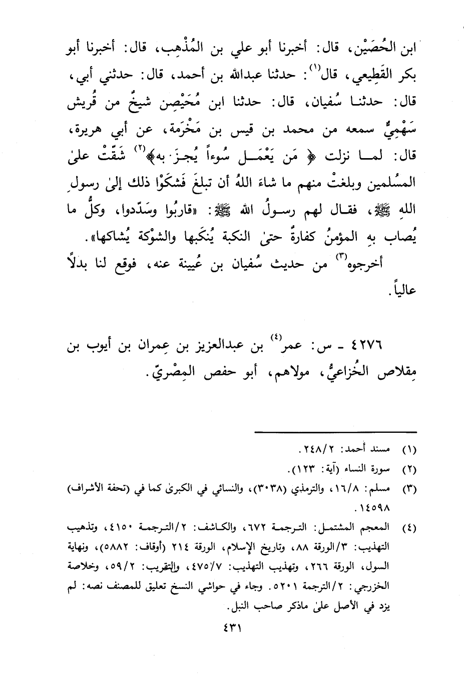 ابن الحصين، قال: أخبرنا أَبُو علي بْن المذهب، قال: أَخْبَرَنَا أَبُو بَكْرٍ القَطِيعِيّ، قال (1) : حَدَّثَنَا عَبد اللَّهِ بْن أَحْمَدَ، قال: حَدَّثني أَبِي، قال: حَدَّثَنَا سُفْيَانُ، قال: حَدَّثَنَا ابْنُ مُحَيْصِنٍ شَيْخٌ مِنْ قُرَيْشٍ سَهْمِيٌّ سَمِعَهُ مِنْ مُحَمَّد بْن قيس بْن مخرمة، عَن أَبِي هُرَيْرة، قال: لَمَّا نزلت [من يعمل سؤءا يُجْزَ بِهِ] (2) شَقَّتْ عَلَى الْمُسْلِمِينَ وبَلَغَتْ مِنْهُمْ مَا شَاءَ اللَّهُ أَنْ تَبْلُغَ فَشَكَوْا ذَلِكَ إِلَى رَسُول اللَّهِ صلى الله عليه وسَلَّمَ، فَقَالَ لَهُمْ رَسُولُ اللَّهِ صلى الله عليه: "قَارِبُوا وسَدِّدُوا، وكُلُّ مَا يُصَابُ بِهِ الْمُؤْمِنُ كَفَّارَةٌ حَتَّى النَّكْبَةِ يُنْكَبُهَا والشَّوْكَةِ يُشَاكُهَا.