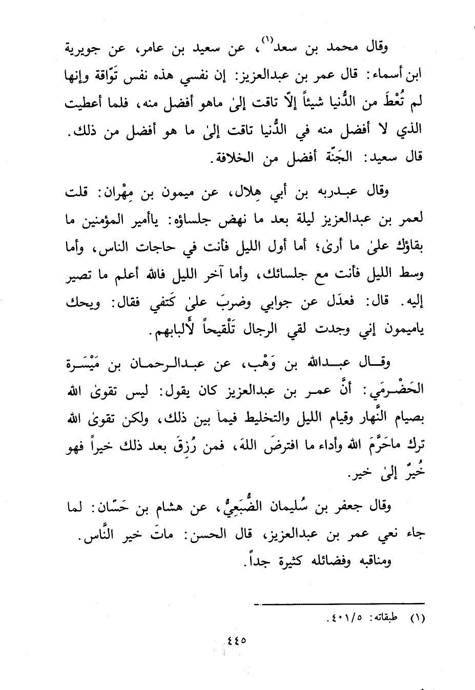 وَقَال مُحَمَّد بْن سعد (1) ، عَن سَعِيد بْن عامر، عن جويرية ابن أسماء: قال عُمَر بْن عبد العزيز: إن نفسي هَذِهِ نفس تواقة وإنها لم تعط من الدنيا شيئا إلا تاقت إِلَى ما هُوَ أفضل مِنْهُ، فلما أعطيت الَّذِي لا أفضل مِنْهُ فِي الدنيا تاقت إِلَى ما هُوَ أفضل من ذَلِكَ. قال سَعِيد: الجنة أفضل من الخلافة.