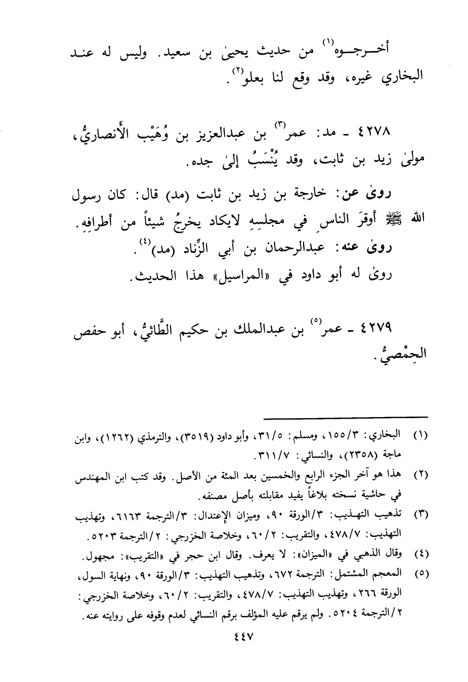 (5) المعجم المشتمل: الترجمة 672، وتذهيب التهذيب: 3 / الورقة 90، ونهاية السول، الورقة 266، وتهذيب التهذيب: 7 / 478، والتقريب: 2 / 60، وخلاصة الخزرجي: 2 / الترجمة 5204. ولم يرقم عليه المؤلف برقم النَّسَائي لعدم وقوفه على روايته عنه.
