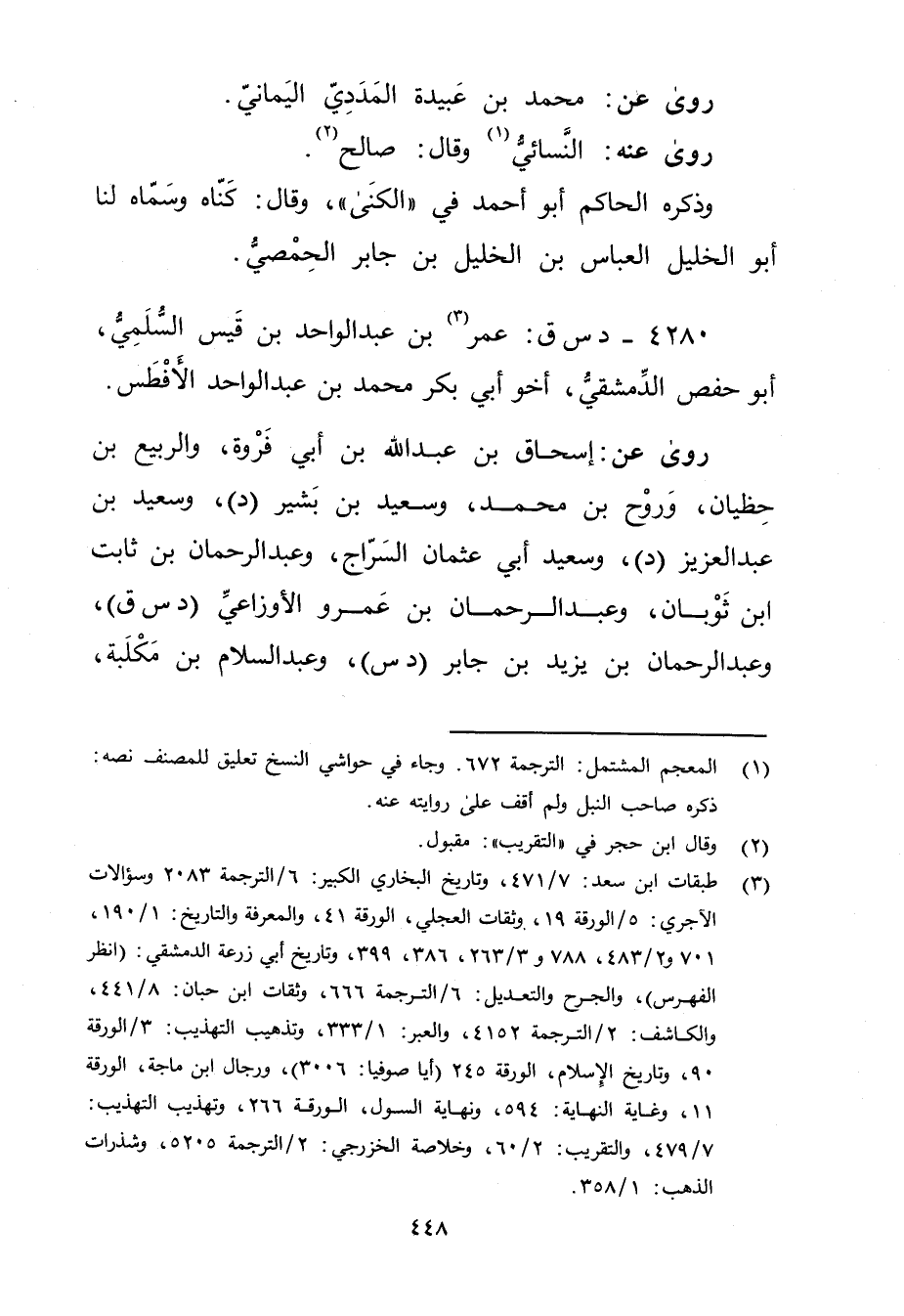 (3) طبقات ابن سعد: 7 / 471، وتاريخ البخاري الكبير: 6 / الترجمة 2083 وسؤالات الآجري: 5 / الورقة 19، وثقات العجلي، الورقة 41، والمعرفة والتاريخ: 1 / 190، 701 و2 / 483، 788 و3 / 263، 386، 399، وتاريخ أبي زرعة الدمشقي:،، والجرح والتعديل: 6 / الترجمة 666، وثقات ابن حبان: 8 / 441، والكاشف: 2 / الترجمة 4152، والعبر: 1 / 333، وتذهيب التهذيب: 3 / الورقة 90، وتاريخ الاسلام، الورقة 245 (أيا صوفيا: 3006) ، ورجال ابن ماجة، الورقة 11، وغاية النهاية: 594، ونهاية السول، الورقة 266، وتهذيب التهذيب: 7 / 479، والتقريب: 2 / 60، وخلاصة الخزرجي: 2 / الترجمة 5205، وشذرات الذهب: 1 / 358.