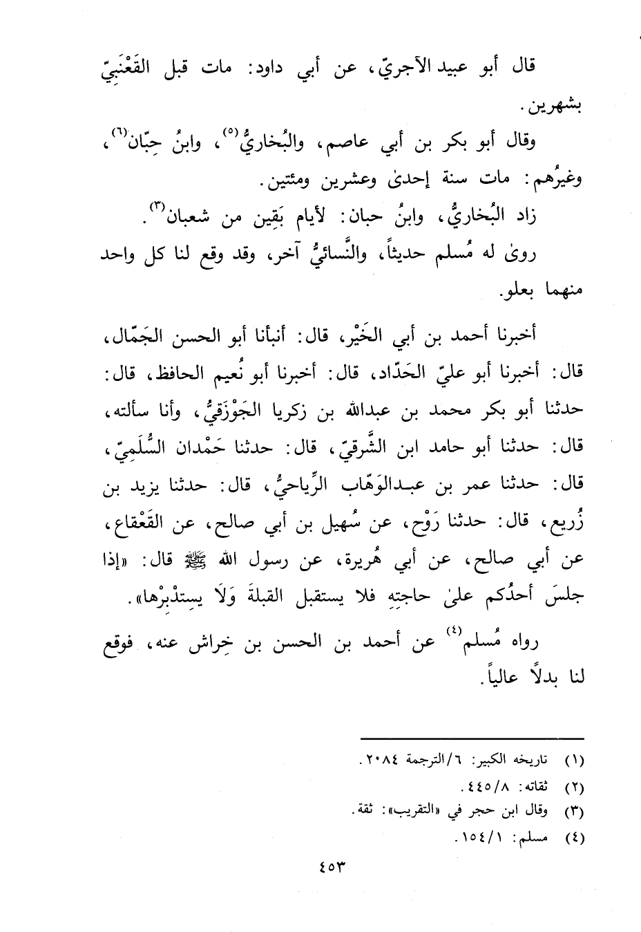 أَخْبَرَنَا أَحْمَدُ بْنُ أَبي الْخَيْرِ، قال: أَنْبَأَنَا أَبُو الْحَسَنِ الجمال، قال: أَخْبَرَنَا أبو علي الحداد، قال: أَخْبَرَنَا أبو نعيم الْحَافِظُ، قال: حَدَّثَنَا أَبُو بَكْر مُحَمَّد بْن عَبد اللَّهِ بْن زَكَرِيَّا الْجَوْزَقِيُّ، وأَنَا سَأَلْتُهُ، قال: حَدَّثَنَا أبو حامد ابن الشَّرْقِيِّ، قال: حَدَّثَنَا حَمْدَانُ السُّلَمِيُّ، قال: حَدَّثَنَا عُمَر بْن عَبْد الْوَهَّابِ الرِّيَاحِيُّ، قال: حَدَّثَنَا يَزِيدُ بْنُ زُرَيْعٍ، قال: حَدَّثَنَا رَوْحُ، عن سهيل بْن أَبي صالح، عن الْقَعْقَاعِ، عَن أَبِي صَالِحٍ، عَن أبي هُرَيْرة، عن رَسُول اللَّهِ صلى الله عليه وسلم قال: إِذَا جَلَسَ أَحَدُكُمْ عَلَى حَاجَتِهِ فَلا يَسْتَقْبِلِ الْقِبْلَةَ ولا يَسْتَدْبِرْهَا.