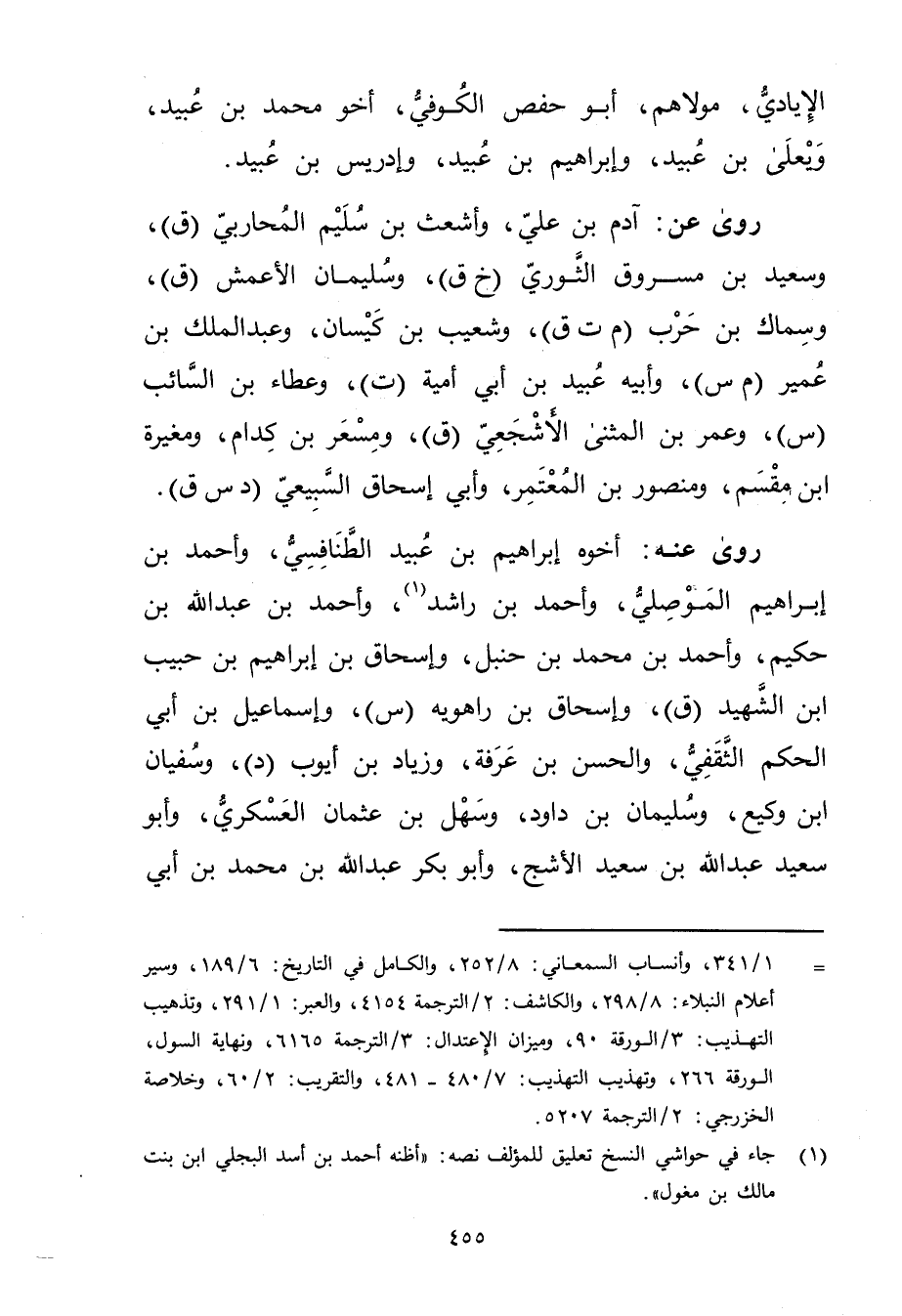= 1 / 341، وأنساب السمعاني: 8 / 252، والكامل في التاريخ: 6 / 189، وسير أعلام النبلاء: 8 / 298، والكاشف: 2 / الترجمة 4154، والعبر: 1 / 291، وتذهيب التهذيب: 3 / الورقة 90، وميزان الاعتدال: 3 / الترجمة 6165، ونهاية السول، الورقة 266، وتهذيب التهذيب: 7 / 480 - 481، والتقريب: 2 / 60، وخلاصة الخزرجي: 2 / الترجمة 5207.