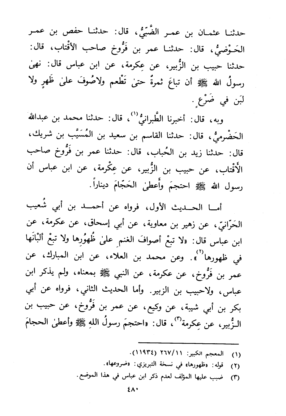 حَدَّثَنَا عُثْمَانُ بْنُ عُمَر الضَّبِّيُّ، قال: حَدَّثَنَا حفص بْن عُمَر الْحَوْضِيُّ، قال: حَدَّثَنَا عُمَر بْنُ فَرُّوخٍ صَاحِبُ الأَقْتَابِ، قال: حَدَّثَنَا حَبِيبُ بْنُ الزُّبَيْرِ، عن عِكْرِمَةَ، عن ابْنِ عَبَّاسٍ قال: نَهَى رَسُول اللَّهِ صلى الله عليه وسَلَّمَ أَنْ تُبَاعَ ثَمَرَةٌ حَتَّى تطعم ولاصوف عَلَى ظَهْرٍ ولا لَبَنَ فِي ضَرْعٍ.
