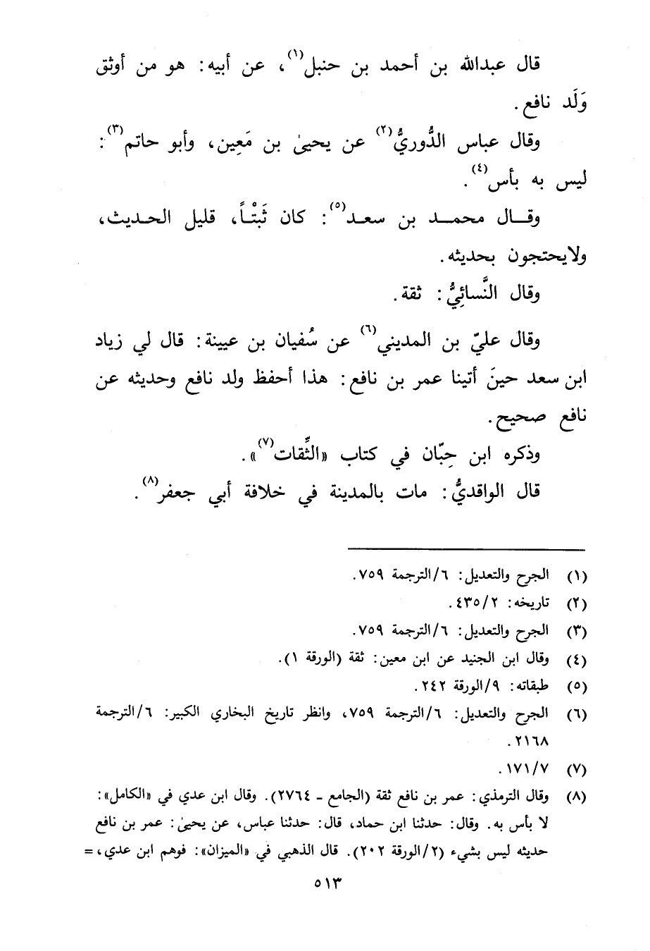 (8) وَقَال التِّرْمِذِيّ: عُمَر بن نافع ثقة (الجامع - 2764) . وَقَال ابن عدي في "الكامل ": لا بأس به. وَقَال: حَدَّثَنَا ابن حماد، قال: حَدَّثَنَا عباس، عن يحيى: عُمَر بن نافع حديثه ليس بشيءٍ (2 / الورقة 202) . قال الذهبي في "الميزان ": فوهم ابن عدي، =