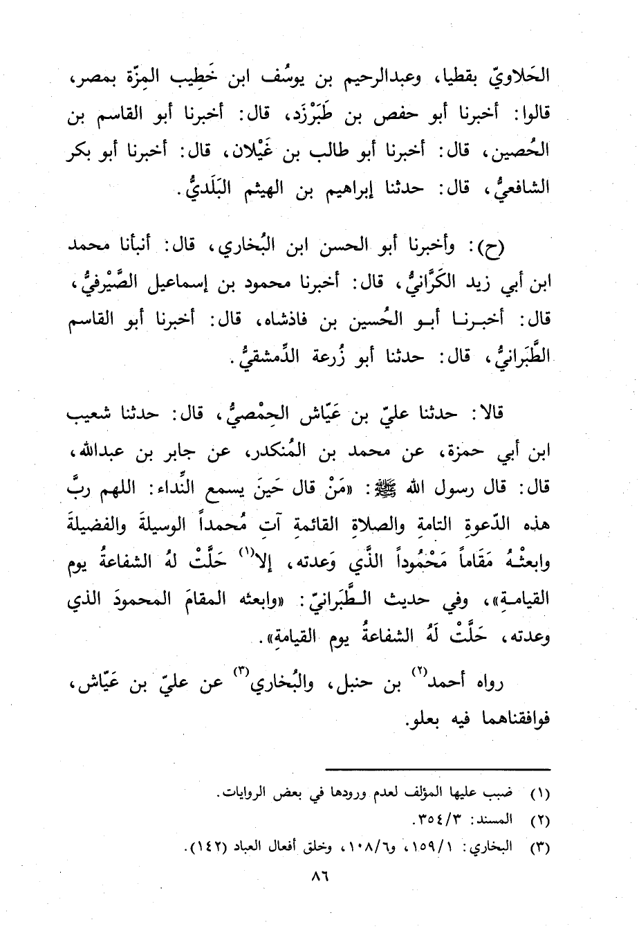 قَالا: حَدَّثَنَا عَلِيُّ بْنُ عَيَّاشٍ الحمصي، قال: حَدَّثَنَا شعيب ابن أَبي حَمْزَةَ، عن مُحَمَّدِ بْنِ الْمُنْكَدِرِ، عَنْ جَابِرِ بْنِ عَبد اللَّهِ، قال: قال رَسُولُ اللَّهِ صلى الله عليه وسلم: من قال حِينَ يَسْمَعُ النِّدَاءَ: اللَّهُمَّ رَبَّ هَذِهِ الدَّعْوَةِ التَّامَّةِ والصَّلاةِ الْقَائِمَةِ آتِ مُحَمَّدًا الْوَسِيلَةَ والْفَضِيلَةَ وابْعَثْهُ مَقَامًا مَحْمُودًا الَّذِي وعَدْتَهُ، إِلا (1) حَلَّتْ لَهُ الشَّفَاعَةُ يَوْمَ الْقِيَامَةِ"، وفي حديث الطبراني: وابعثه المقام المحمود الَّذِي وعدته، حلت لها الشفاعة يوم القيامة.