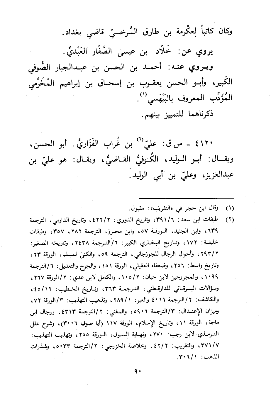 (2) طبقات ابن سعد: 6 / 391، وتاريخ الدوري: 2 / 422، وتاريخ الدارمي، الترجمة 639، وابن الجنيد، الورقة 57، وابن محرز، الترجمة 282، 357، وطبقات خليفة: 172، وتاريخ البخاري الكبير: 6 / الترجمة 2438، وتاريخ الصغير: 2 / 293، وأحوال الرجال للجوزجاني، الترجمة 59، والكنى لمسلم، الورقة 23، وتاريخ واسط: 256، وضعفاء العقيلي، الورقة 151، والجرح والتعديل: 6 / الترجمة 1099، والمجروحين لابن حبان: 2 / 105، والكامل لابن عدي: 2 / الورقة 267،
