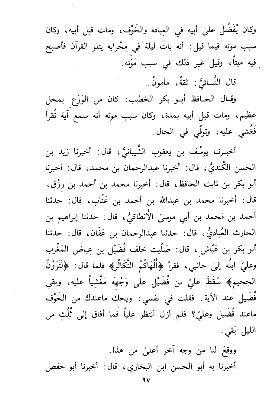 أَخْبَرَنَا يوسف بْن يعقوب الشيباني، قال: أَخْبَرَنَا زيد بْن الحسن الكندي، قال: أَخْبَرَنَا عَبْد الرحمن بْن مُحَمَّد، قال: أخبرنا أَبُو بَكْرِ بْنُ ثَابِتٍ الْحَافِظُ، قال: أَخْبَرَنَا مُحَمَّد بْن أحمد بْن رزق، قال: أَخْبَرَنَا مُحَمَّد بْن عَبد اللَّهِ بْن أَحْمَد بْن عتاب، قال: حَدَّثَنَا أحمد بْن مُحَمَّد بْن أَبي موسى الأنطاكي، قال: حَدَّثَنَا إبراهيم بْن الحارث العبادي، قال: حَدَّثَنَا عبد الرحمن بْن عفان، قال: حَدَّثَنَا أبو بكر بْن عياش، قال: صليت خلف فضيل بْن عياض المغرب وعلي ابْنه إِلَى جانبي، فقرأ (ألهاكم التكاثر) فلما قال: (لترون الجحيم) سقط علي بْن فضيل عَلَى وجهه مغشيا عَلَيْهِ، وبقي فضيل عند الآية. فقلت فِي نفسي: ويحك ما عندك من الخوف ما عند فضيل وعلي؟ فلم أزل أنتظر عليا فما أفاق إِلَى ثلث من الليل بقي.