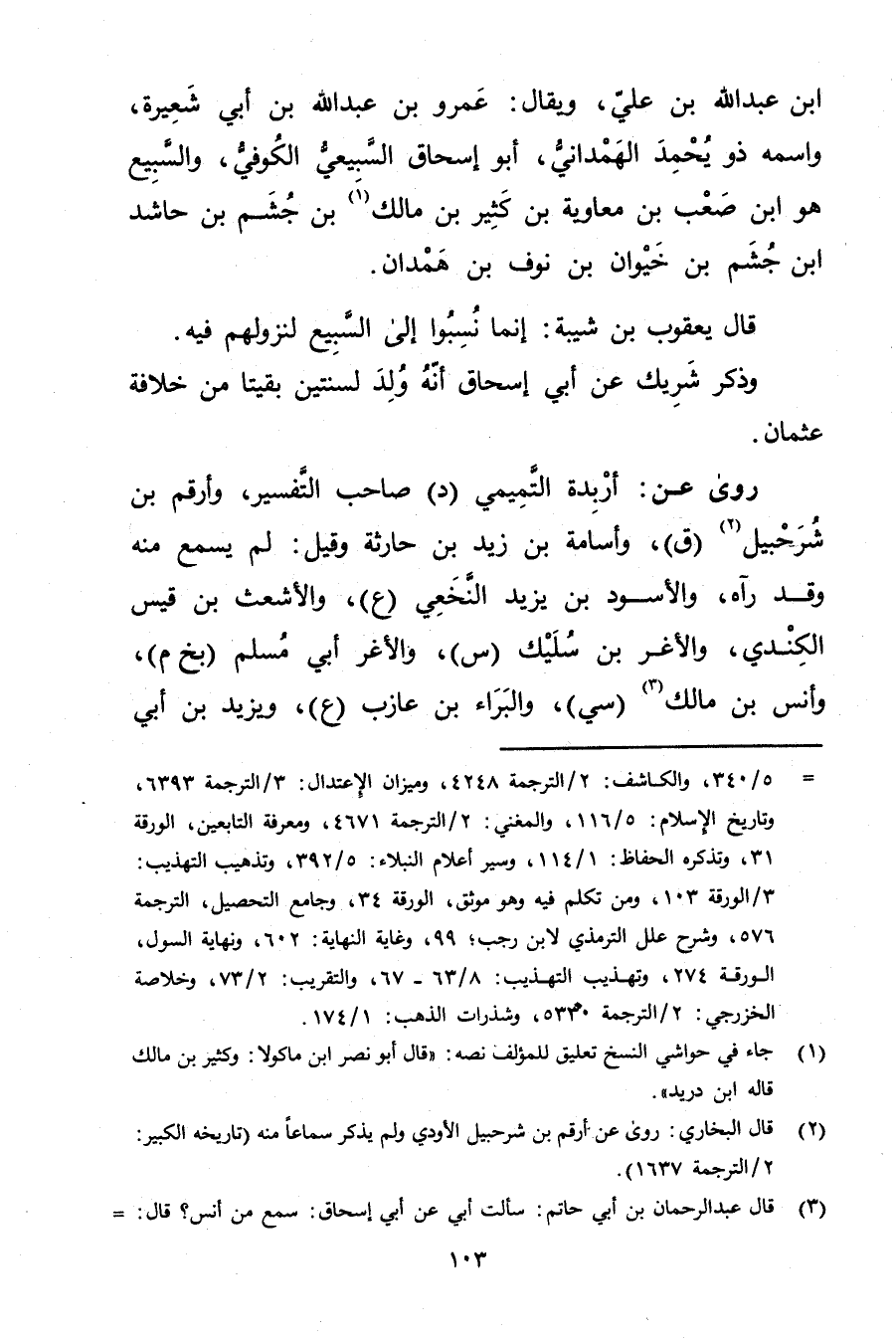 ابن عَبد اللَّه بْن علي، ويُقال: عَمْرو بْن عَبد اللَّهِ بْن أَبي شعيرة، واسمه ذو يحمد الهمداني، أبو إسحاق السبيعي الكوفي، والسبيع هو ابْن صعب بْن معاوية بْن كثير بْن مالك (1) بن جشم بن حاشد ابن جشم بْن خيوان بْن نوف بْن همدان.