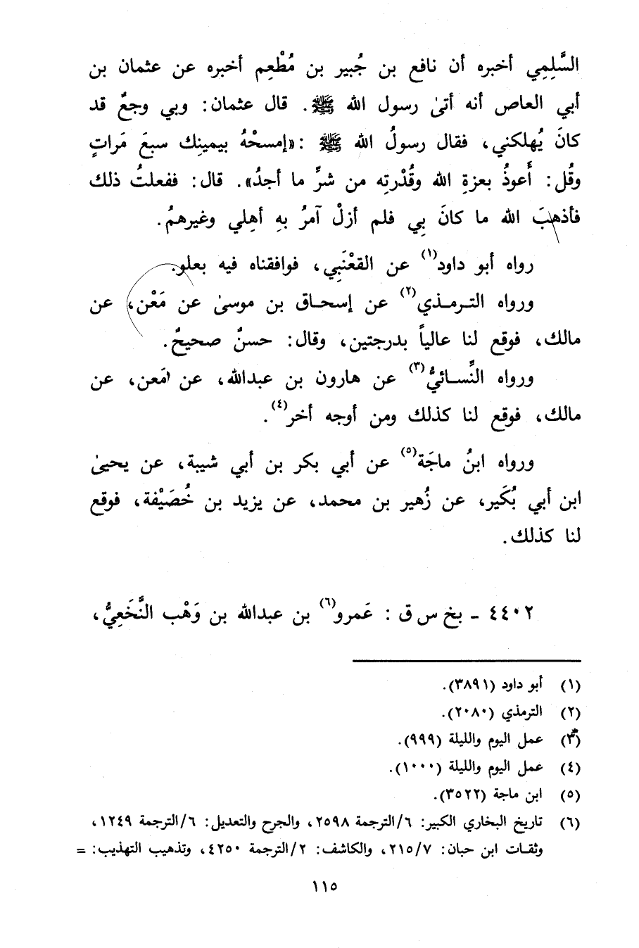السَّلَمِيَّ أَخْبَرَهُ أَنَّ نَافِعَ بْنَ جُبَيْرِ بْنِ مُطْعَمٍ أَخْبَرَهُ عَنْ عُثْمَانَ بْنِ أَبي الْعَاصِ أَنَّهُ أَتَى رَسُولَ اللَّهِ صلى الله عَلَيْهِ وسَلَّمَ. قال عُثْمَانُ: وبِي وجَعٌ قَدْ كَانَ يُهْلِكُنِي، فَقَالَ رَسُول اللَّهِ صلى الله عليه وسَلَّمَ: "امْسَحْهُ بِيَمِينِكَ سَبْعَ مَرَّاتٍ وقُلْ: أَعُوذُ بِعِزَّةِ اللَّهِ وقُدْرَتِهِ مِنْ شَرِّ مَا أَجِدُ ". قال: ففعلت ذلك فأذهب الله ماكان بِي فَلَمْ أَزَلْ آمُرُ بِهِ أَهْلِي وغَيْرَهُمْ.