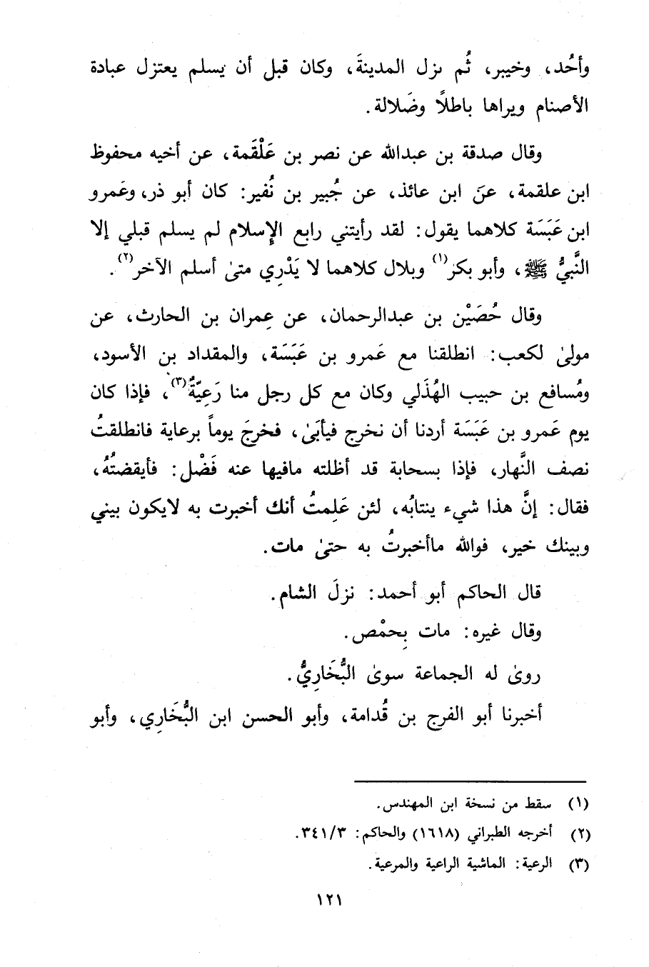 وَقَال حصين بْن عبد الرحمن، عَنْ عِمْران بْن الحارث، عَنْ مولى لكعب: انطلقنا مع عَمْرو بْن عبسة، والمقداد بْن الأسود، ومسافع بْن حبيب الهذلي وكان مع كل رجل منا رعية (3) ، فإذا كان يوم عَمْرو بْن عبسة أردنا أن نخرج فيأبى، فخرج يوما برعاية فانطلقت نصف النهار، فإذا بسحابة قد أظلته ما فيها عنه فضل: فأيقضته، فقال: إن هذا شيء ينتابه، لئن علمت أنك أخبرت به لا يكون بيني وبينك خير، فواللَّه ما أخبرت به حتى مات.