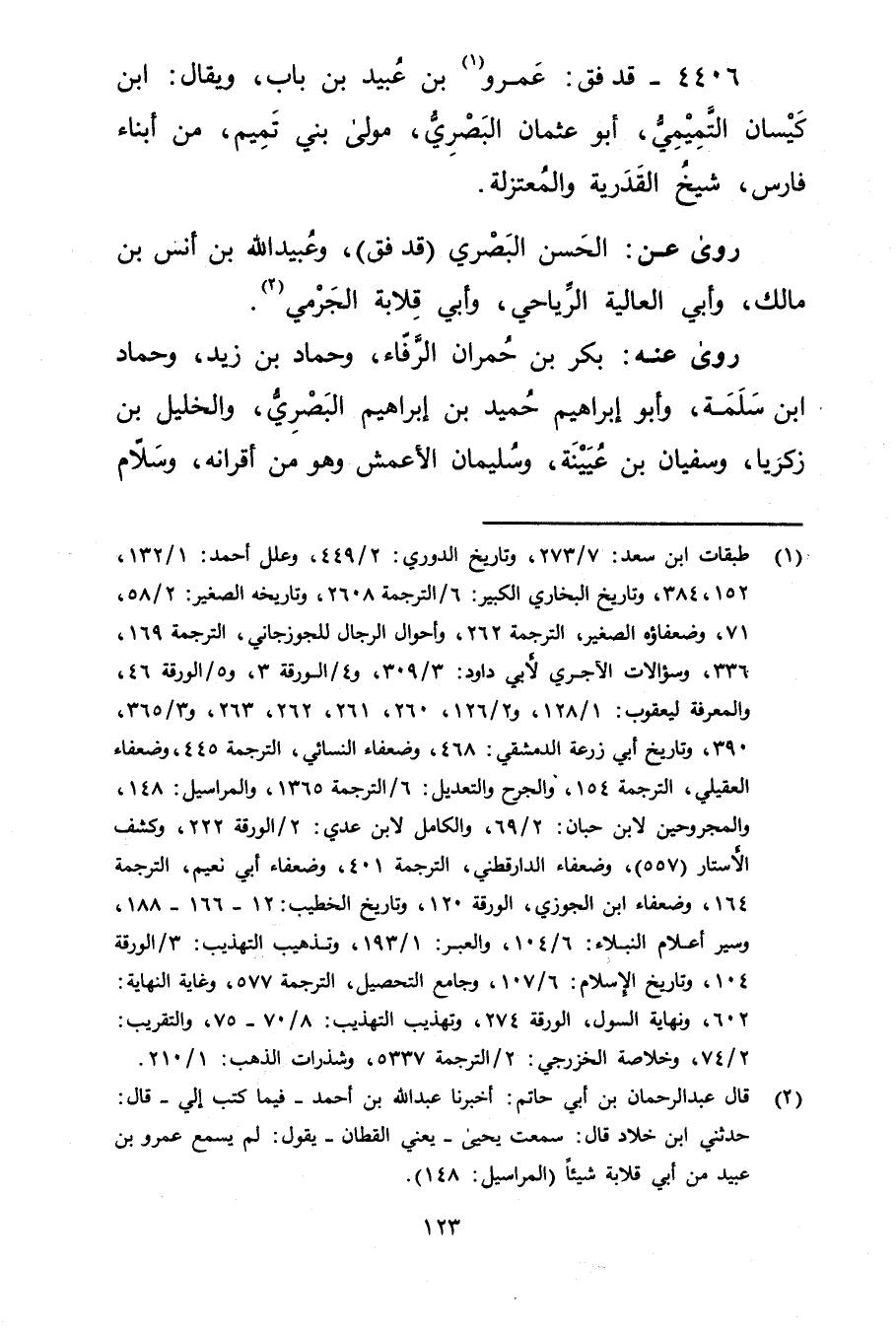 4406 - قد فق: عَمْرو بن عُبَيد بن باب (1) ، ويُقال: ابْن كيسان التميمي، أبو عُثْمَان البَصْرِيّ، مولى بني تميم، من أبناء فارس، شيخ القدرية والمعتزلة.