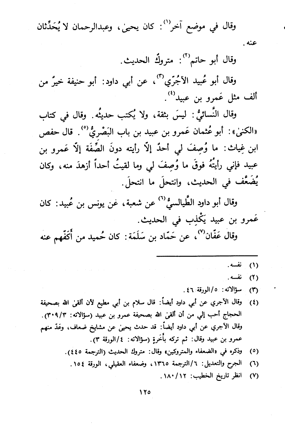 (4) وَقَال الآجري عَن أبي داود أيضا: قال سلام بن أَبي مطيع لان ألقى اللَّه بصحيفة الحجاج أحب إلي من أن ألقى اللَّه بصحيفة عَمْرو بن عُبَيد (سؤالاته: 3 / 309) . وَقَال الآجري عَن أبي داود أيضا: قد حدث يحيى عن مشايخ ضعاف، وعد منهم عَمْرو بن عُبَيد وَقَال: ثم تركه بأخرة (سؤالاته: 4 / الورقة 3) .