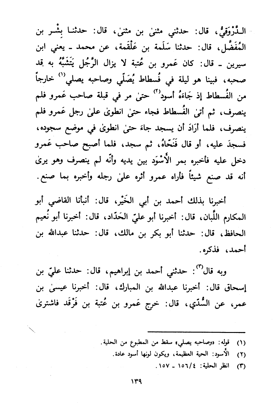 الدروقي، قال: حَدَّثَنِي مثنى بْن مثنى، قال: حَدَّثَنَا بِشْرُ بْنُ الْمُفَضَّلِ، قال: حَدَّثَنَا سَلَمَةُ بْنُ عَلْقَمَةَ، عَنْ مُحَمَّد، يعني ابْن سيرين، قال: كان عَمْرو بْن عتبة لا يزال الرجل يتشبه به قد صحبه، فبينا هو ليلة في فسطاط يصلي وصاحبه يصلي (1) خارجا من الفسطاط إذ جاءه أسود (2) حتى مر في قبلة صاحب عَمْرو فلم ينصرف، ثم أتى الفسطاط فجاء حتى انطوى على رجل عَمْرو فلم ينصرف، فلما أراد أن يسجد جاء حتى انطوى في موضع سجوده، فسجد عليه، أو قال فنحاه، ثم سجد، فلما أصبح صاحب عَمْرو دخل عليه فأخبره بمر الأسود بين يديه وأنه لم ينصرف وهو يرى أنه قد صنع شيئا فأراه عَمْرو أثره على رجله وأخبره بما صنع.