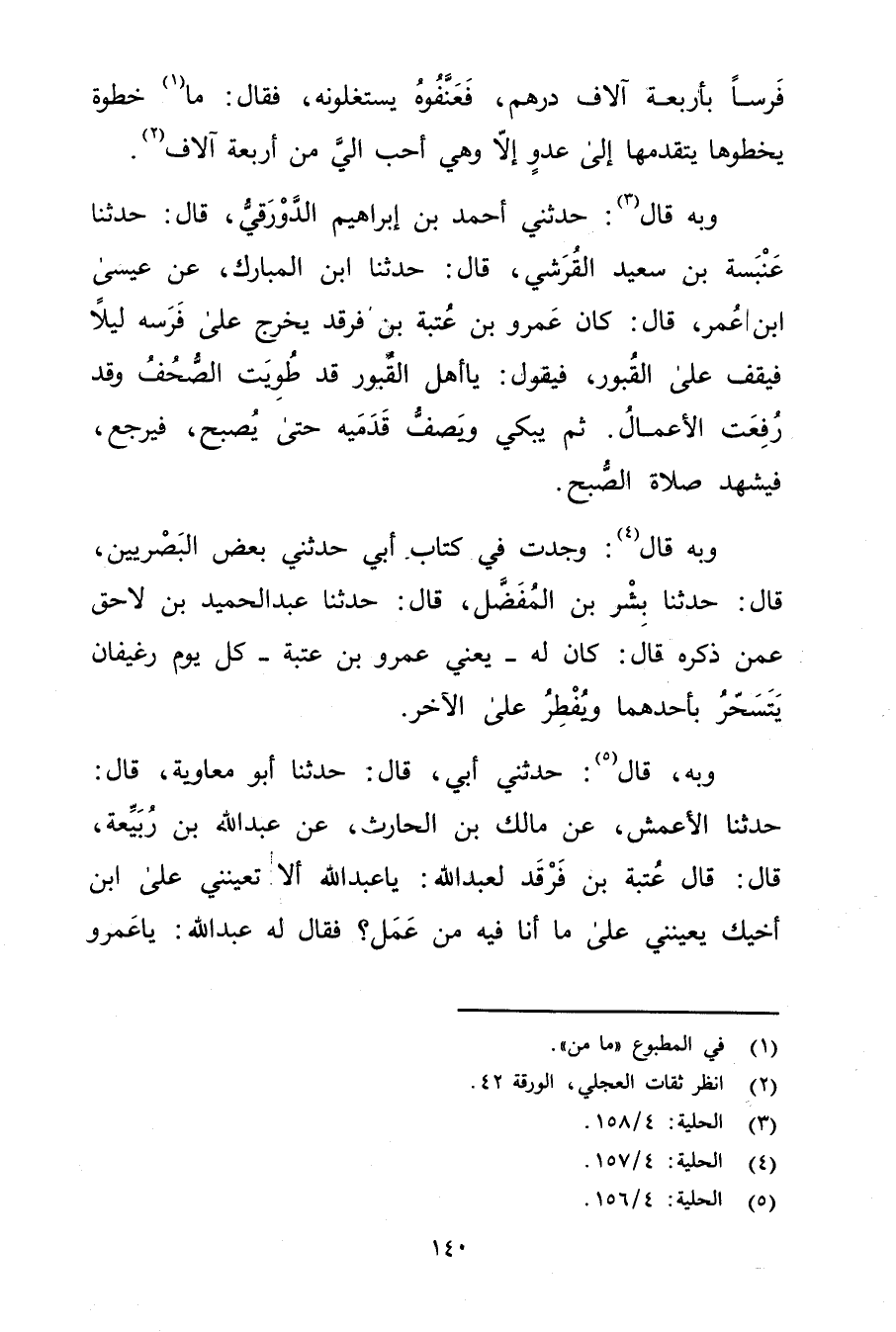 وبه قال (3) : حَدَّثَنِي أَحْمَد بْن إبراهيم الدورقي، قال: حَدَّثَنَا عنبسة بْن سَعِيد القرشي، قال: حَدَّثَنَا ابن المبارك، عن عيسى ابن عُمَر، قال: كان عَمْرو بْن عتبة بْن فرقد يخرج على فرسه ليلا فيقف على القبور، فيقول: يا أهل القبور قد طويت الصحف وقد رفعت الأعمال. ثم يبكي ويصف قدميه حتى يصبح، فيرجع، فيشهد صلاة الصبح.