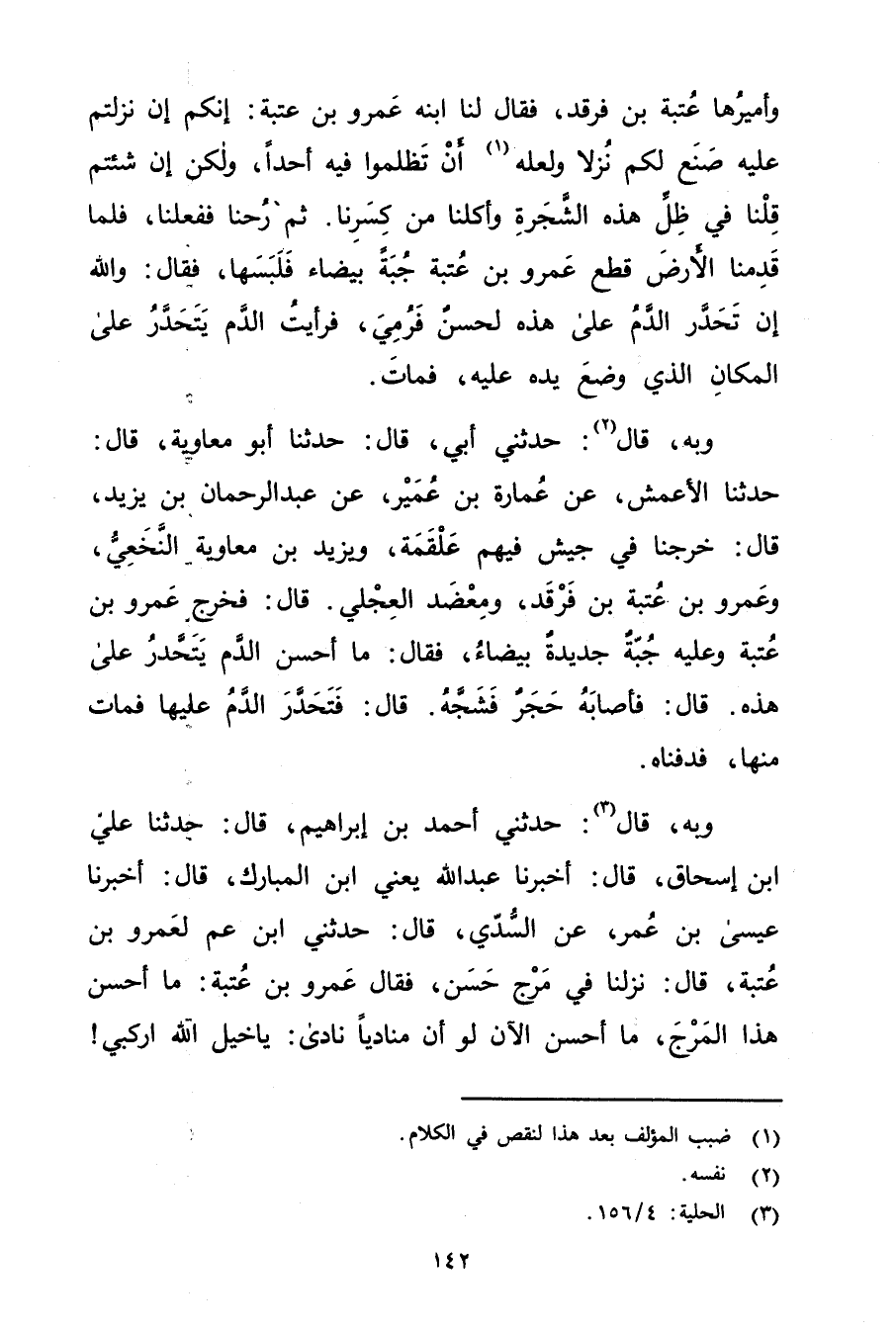 وبه، قال (2) : حَدَّثني أبي، قال: حَدَّثَنَا أَبُو مُعَاوِيَةَ، قال: حَدَّثَنَا الأَعْمَش، عَنْ عُمَارَة بْن عُمَير، عَنْ عَبْدِ الرَّحْمَنِ بْن يزيد، قال: خرجنا في جيش فيهم علقمة، ويزيد بْن معاوية النخعي، وعَمْرو بْن عتبة بْن فرقد، ومعضد العجلي. قال: فخرج عَمْرو بْن عتبة وعليه جبة جديدة بيضاء، فقال: ما أحسن الدم يتحدر على هذه. قال: فأصابه حجر فشجه. قال: فتحدر الدم عليها فمات منها، فدفناه.