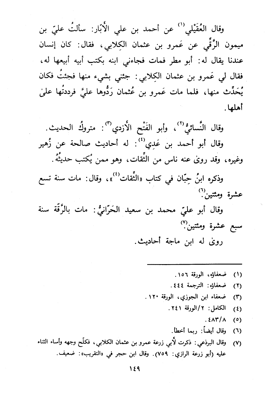 (7) وَقَال البرذعي: ذكرت لابي زرعة عَمْرو بن عثمان الكِلابي، فكلح وجهه وأساء الثناء