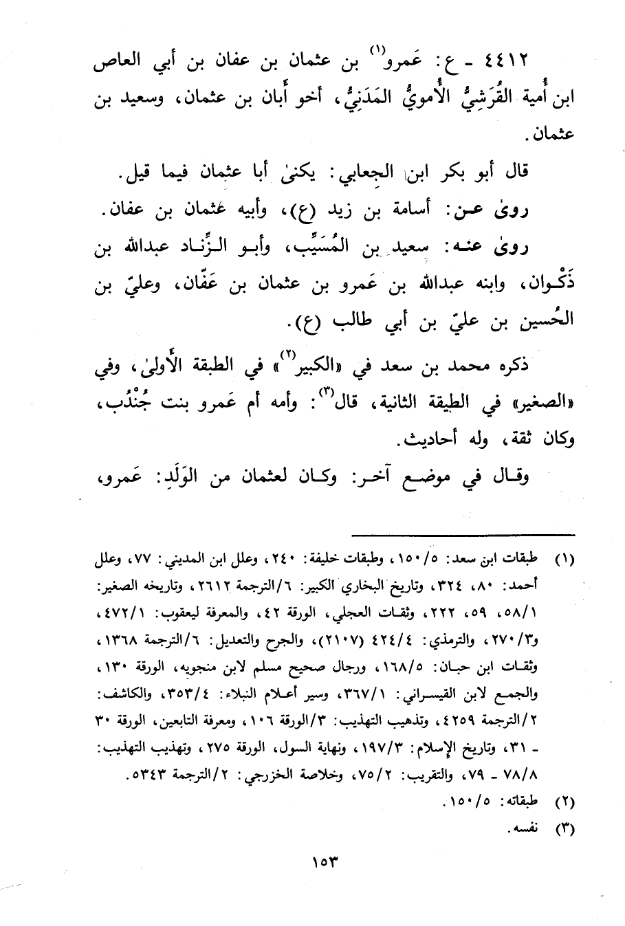 4412 - ع: عَمْرو بن عُثْمَان بن عفان بن أَبي العاص ابن أمية القرشي الأُمَوِي المدني (1) ، أخو أبان بْن عُثْمَان، وسَعِيد بْن عُثْمَان.