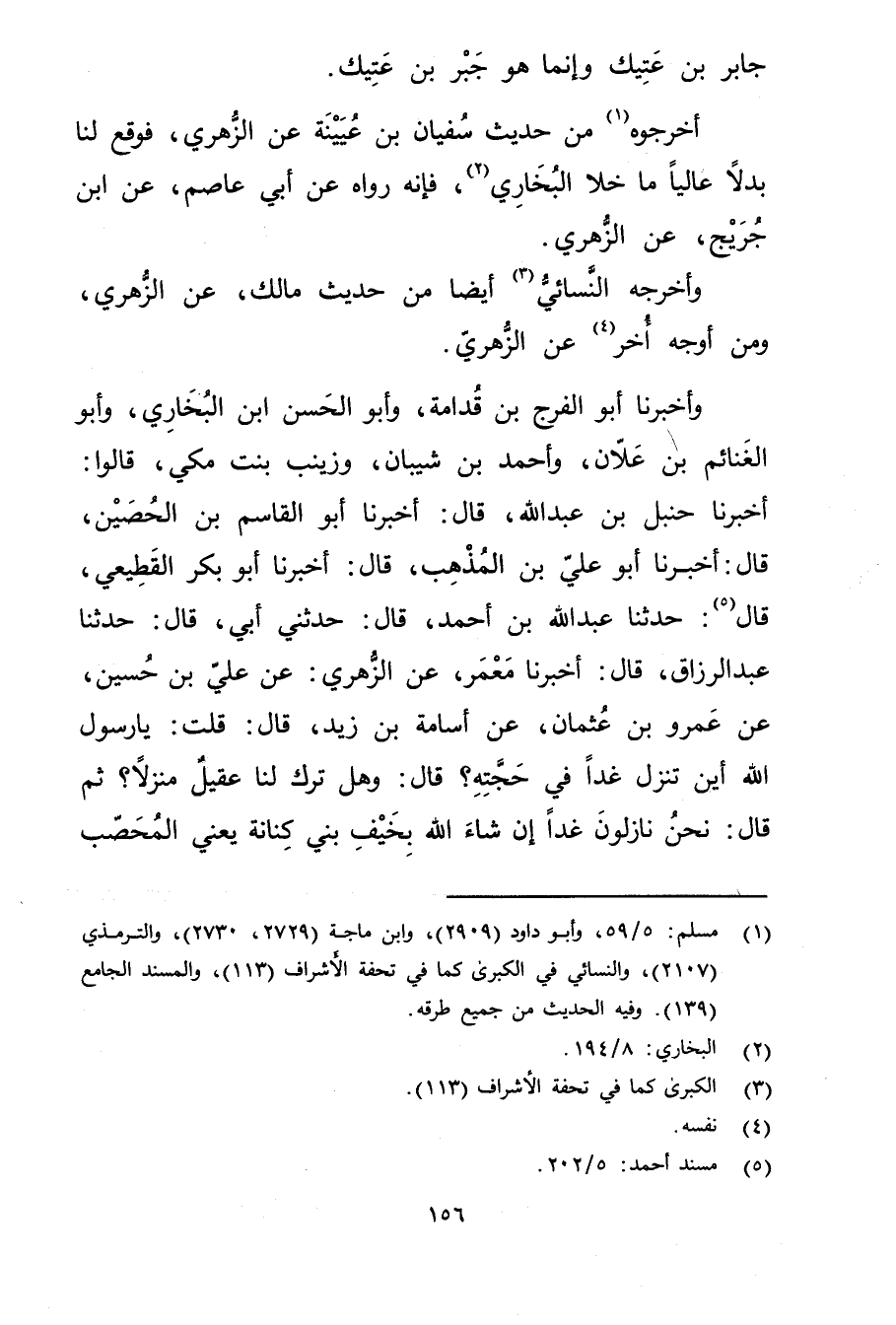 وأَخْبَرَنَا أَبُو الْفَرَجِ بْنُ قُدَامَةَ، وأَبُو الْحَسَنِ بْنُ الْبُخَارِيِّ، وأبو الغنائم بْن علان، وأحمد بْن شَيْبَانَ، وزينب بنت مكي، قالوا: أَخْبَرَنَا حنبل بْن عَبد اللَّهِ، قال: أخبرنا أَبُو الْقَاسِمِ بْن الحصين، قال: أَخْبَرَنَا أبو علي بْن المذهب، قال: أَخْبَرَنَا أَبُو بَكْرٍ القَطِيعِيّ، قال (5) : حَدَّثَنَا عَبد اللَّهِ بْن أَحْمَدَ، قال: حَدَّثني أبي، قال: حَدَّثَنَا عَبْد الرَّزَّاقِ، قال: أَخْبَرَنَا مَعْمَرٌ، عَنْ الزُّهْرِيّ: عَنْ عَلِيِّ بْنِ حُسَيْنٍ، عَنْ عَمْرو بْن عثمان، عَنِ أُسَامَةَ بْنِ زَيْدٍ، قال: قُلْتُ: يَا رَسُولَ اللَّهِ أَيْنَ تَنْزِلُ غَدًا فِي حَجَّتِهِ؟ قال: وهَلْ تَرَكَ لَنَا عَقِيلٌ مَنْزِلا؟ ثُمَّ قال: نَحْنُ نَازِلُونَ غَدًا إِنْ شَاءَ اللَّهُ بِخَيْفِ بَنِي كِنَانَةَ يعني المحصب